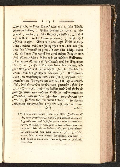 „des Noah , in sieben Hauptstückcn an: i. keine Abgöt-.,,terey zu treiben, 2. Gottes Namen zu ehren; z. nie-„mand zutödtcn; 4. keine Unzucht zu treiben; Z. nichts„zu rauben; 6. die Obern zu ehrm; 7. uicht rohes„Fleisch zu essen. Wenn wir das letzte Stück ausneh-„men, welches wohl nur hinzugethan war, um den Zü-nden kein Aergerniß zu geben, so war alles übrige nichts„als ein kurzer Znnbcgnff der vernünftigen Religion und>„des Naturgesetzes; daher auch der gelehrte Geldenus„sein ganzes. Natur-und Völkerrecht nach den Satzungen„der Hebräer, aufdiesc ^rsecepta ^vsctucs gcbauet, und„die Religions-und bürgerliche Freyheit der ?role!^to-„rum Oomicilii genugsam bewiesen hat» kVlaimotti-„des, der verständigste unter allen Juden, beschreibt diese„vernünftigen Zudcngenoffen eben so, und sagt ausdrück-„lich, daß sie vorder verbunden gerveftn, sich be-„schneiden nocb raufen zu laMn, und daß sie doch„als fromme aus andern Völkern aufgenommen„roordcn, indem den Israeliren unvcrboren ve»„Xvesen, solchen teuren einen Wohnsiy in ihrem„Gebieee anzurveiscn. (") Er sagt sogar an einem