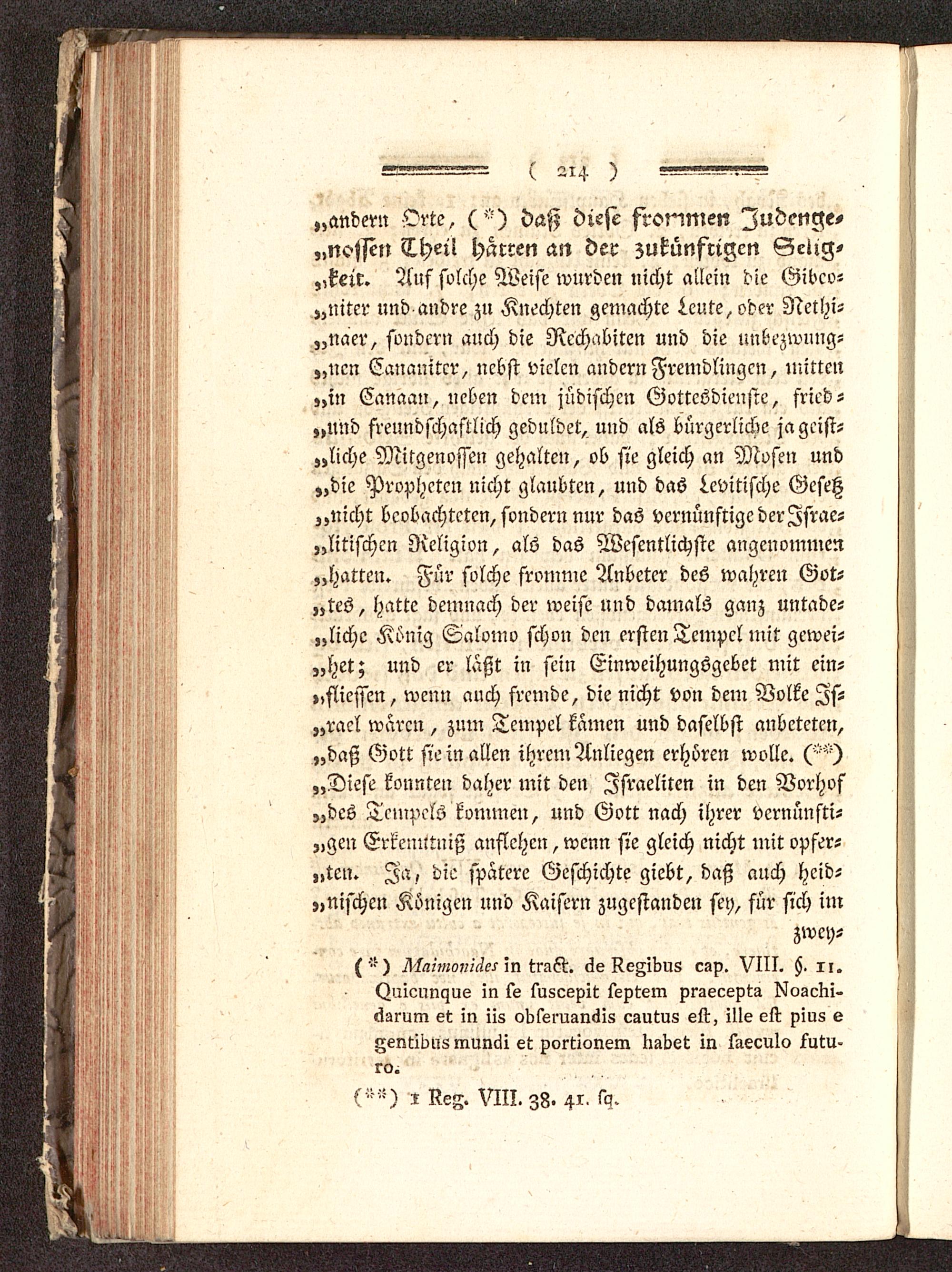 „andern Orte, ('"') daß diese frommen Iudenge-„nossen Theil harren an der zukünftigen Gctig-„keir. Auf solche Weise wurden nicht allein die Gibcv-„niter und andre zu Knechten gemachte Leute, oder Nethi-„naer, sondern auch die Rcchabitcn und die unbezwung-„ncn Canauitcr, nebst vielen andern Fremdlingen, mitten„in Canaan, neben dem jüdischen Gottesdienste, fried-,»und freundschaftlich geduldet, und als bürgerliche ja geist-liche Mitgenossen gehalten, ob sie gleich an Mosen und„die Propheten nicht glaubten, und das Levitische Gesetz„nicht beobachteten, sondern nur das vernünftige der Israe-litischen Religion, als das Wesentlichste angenommen„hatten. Für solche fromme Anbeter des wahren Got-„tes, hatte demnach der weise und damals ganz untade-„lichc König Salomo schon den ersten Tempel mit gewei-tet; und er laßt in sein Einweihungsgebet mit ein-».siiessen, wenn auch fremde, die nicht von dem Volke Zs-„rael wären, zum Tempel kämen und daselbst anbeteten,„daß Gott sie in allen ihrem Anliegen erhören wolle. ( " )„Diese konnten daher mit den Zsraeliten in den Vorhof„des Tempels kommen, und Gott nach ihrer vernünfti-gen Erkenntniß anflehen, wenn sie gleich nicht mit opfer-ten. Za , die spatere Geschichte giebt, daß auch heid-nischen Königen und Kaisern zugestanden sey, für sich im
