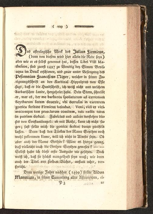 as astrologische Werk des Julius Zirmieus,(denn von diesem wird hier allein die Rede seyn)oder wie er es selbst gencnnet hat, dessen lubri Vill Kia-tkeleoz, sind zuerst 1497 zu Venedig bey Simon Bcvil-aaua im Druck erschienen, und zwar unter Besorgung despescennius Franciscus Niger, welcher in seiner Zu-eignungsschrift an den Kardinal Hippolytus von Estesagt, daß er die Handschrift, ich weiß nicht aus welchembarbarischen 5ande, hergeholet habe. Dein Stern, schreibter, war es, der me KsrKzros spoliaturum uä extrememKc^tnzrum fecem 6euexit, vbi ^etru5us in c^rceiemzottics feritgte k^irmicus I-ititabst. Veni, vicii et vici»mecumyue tam praeclsrum comitem, tuis raciiis turusin pgtriam cZec^uxi^ Fabricius und andere verstehen die-ses von Constantinopel: ob mit Recht, kann ich nicht sa-gen; fast sollte mich die Zottica seritas daran zweifelnlassen. Denn daß den Türken der Name Scythen nochwohl zukommen könne, will ich nicht in Abrede seyn.- Obaber auch der Name Gothcn? Ware es, hierzu genug,daß vielleicht auch die Gothen Scythen gewesen? —- —Selbst habe ich diese erste Ausgabe nie gesehen. Dochweiß ich, daß sie höchst mangelhaft seyn muß; wie dennauch der Titel nur siebm Bücher, anstatt achte, ver--spricht. . , ,''