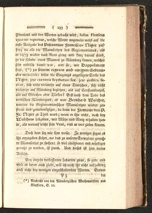 Firmieus mit den Worten gedacht wird, luliug klrmicusou!>s'rv>- r^perilur, welche Worte ungcmcin wohl auf dieerste Ausgabe des petcennius Hranciseus Niacr pas-sn; da alle die Manuseripte des Rcgiomontanus, alscr 147Z wieder nach Noin gieng und kurz darauf starb,in die Hände eines Mannes zu Nürnberg kamen, welchersehr neidisch damit ww, uav sie, wie Doppel ma^rsagt, za seinem eigenen und einigem Gebrau-che aufbeyielt: sollte die Eingangs angeführte Stelle des^^ger, jene cxrrem!, Sc^lKsrui» scx jene izolkic? 5e-riuis, sich nicht vielmehr auf eiuen Deutschen, sich nichtvielmehr auf Nürnberg beziehen, als auf Constantinopcl,als auf Griechen oder Türken? Erst nach dem Tode desneidischen Nürnbergers, es war Bernhard VOairher,wurden die Negiomontanschen Manuseripte wieder zer-streut und-gemeinnütziger, da denn der Firmicu? dem^r. Ni^cr zu Theil ward; wenn er ihn nicht, noch beyU?alrhcrs Lebzeiten, mit Mühe und Noch erhalten hat-te, als worauf leicht sein Vem, vicii et v-c» zielen könnte»