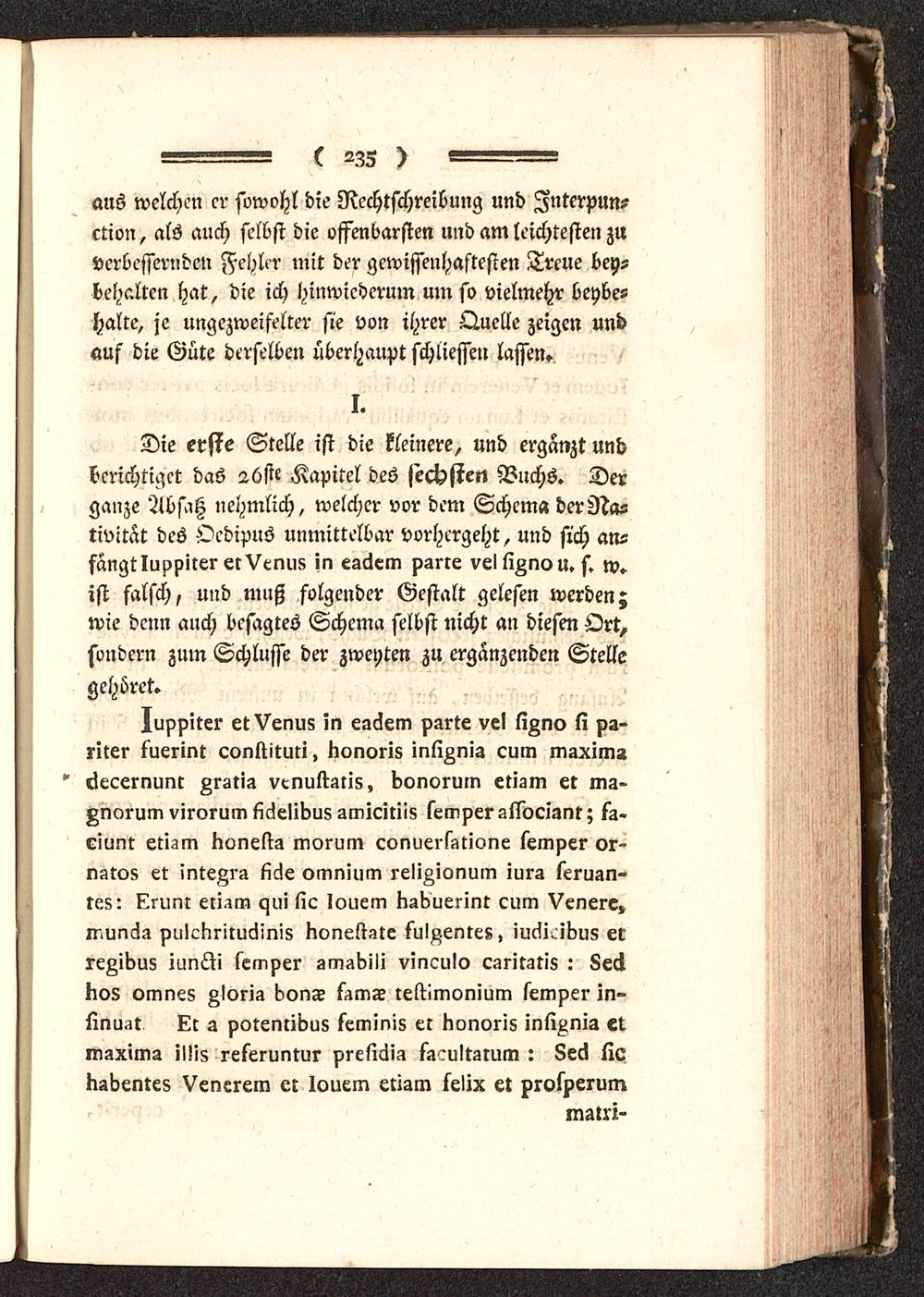 Die erste Stelle ist die kleinere, und ergänzt undberichtiget das 2üstc Kapitel des sechsten Buchs. Derganze Absitz nehmlich, welcher vor dem Schema derNa-tivitat des Oedipus unmittelbar vorhergeht, und sich an-fangtlupvirer er Venus in esclem vsrre vel lißno u. s. w»ist falsch, und muß folgender Gestalt gelesen werden;wie denn auch besagtes Schema selbst nicht an diesen Ort,sondern zum Schlüsse der zweyten zu ergänzenden Stellegehöret»