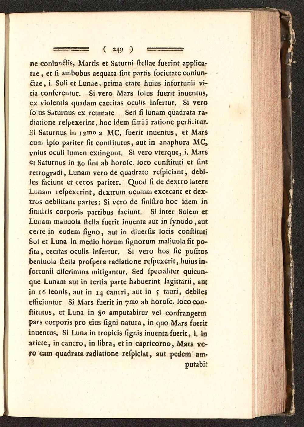 ne coniunKis, ^lzrtis et 8srurni lrellse fuerinr gpplica»rse , er li smvoous sequsrs iinr vsrris socierare c^niun»eine, i 8oli er l.un.,e, prims ersre nuius intorcunil vi-ri-i conserer.rur. 8i vero K/isrs lolus suerir inuentus,ex violenris czusäsm csecitas ocu>>8 infertur. 8i veroso!us 8-iturnu<! ex reuwsre 8ect i> lunsm czusclrats rs-ciislione respexcrinr, noc i6em limiii rsliune peinVirur.Li 8srurnu8 in i2wo » kiL. suerir inucnrus, er /^arscum iplo psrirer tit conuirurus, gut in snspnors ^lL,vnius oculi lumcn exiingunt. 8i vero vterczue, i. ^tsrser 8sturnus in 80 linr so norolc^ loco cc>nltiruri er lintrerro^cli, I.unsm vero cle czusärsto relpicisnr, äeoi-les fsciunr er cecos vsrirer. (^uoä li cie clextro Islerel-unsm respex^rint, cjcxrrum oculum excecsnt er ciex-trog nebilusni ssrtes: 8i vero cje iiniliro noc ictem inlin>llri5 corvori« vsrrious ssciunr. 8i inrer 8olcm etI-unslii Mitiiuols liells suerir inuents sur in lvnocio.sutceicein eoctem lr^no, sut in 6iuerlis lociz conlrirutiLlll er I.UNS in menio Korum li^norum msliuolslic vo-lics, cecitsz oculis interrur. 8i vero nvs iic poiirosbeniuols lrells vrospers rsciisrione respexerir, nuius in-Lorrunii ailcrimins mitiZiinrur. 8ec! Ipecisliter czuicun-«zue I.UN3M sur in rertis psrte Ksbuerint ss^irrsrii, gutin 16 leonis, sur in 14 csncri, sur in s lsuri, äeoileseKciuntur 8i ^lsrs suerir in ^mo sr> norolc. lococon-ltirurus, er I^uns in zo sniputskirur vel consrsnActutpsrs corporis pro eius llßni nsturs, in <^uo I^l-»r8 sueritinuenrus. 8i I.uns in rropicis liAr.is inuenls suerir, i. insriete, in csncro, in livrs, er in cspricorno, ^lsrs ve-esm tzuaörsra raöiillione respicist, sut vectem sm-