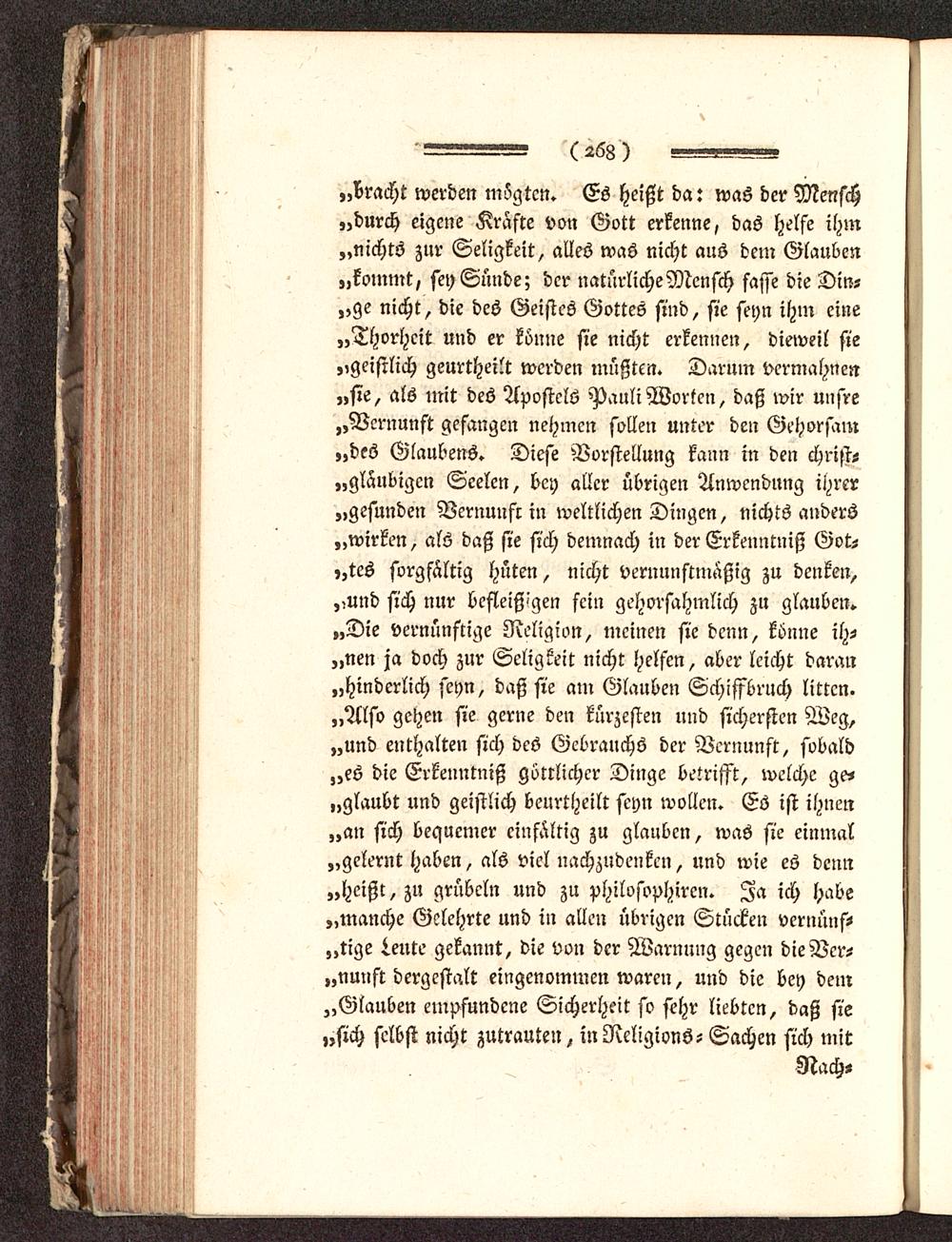 „bracht werden mogtcn. Es heißt da: was der Mensch„durch eigene Kräfte von Gott erkenne, das helfe ihm„nichts zur Seligkeit, alles was nicht aus dem Glauben„kommt, sey Sünde; der natürliche Mensch fasse die Din?„ge nicht, die des Geistes Gottes sind, sie seyn ihm eine„Thorheit und er könne sie nicht erkennen, dieweil sie„geistlich geurtheilt werden müßten. Darum vermahnen„sie, als mit des Apostels Pauli Worten, daß wir unsre„Vernunft gefangen nehmen sollen unter den Gehorsam„des Glaubens. Diese Vorstellung kann in den christ-„gläubigen Seelen, bey aller übrigen Anwendung ihrer„gesunden Vernunft in weltlichen Dingen, nichts anders„wirken, als daß sie sich demnach in der Erkenntniß Got-,,tcs sorgfältig hüten, nicht vernunstmaßig zu denken,,,und sich nur befleiß-'gen fein gehorsahmlich zu glauben»„Die vernünftige Religion, meinen sie denn, könne ih-„nen ja doch zur Seligkeit nicht helfen, aber leicht daran„hinderlich seyn, daß sie am Glauben Schiffbruch litten.„Also gehen sie gerne den kürzesten und sichersten Weg,„und enthalten sich des Gebrauchs der Vernunft, sobald„es die Erkenntniß göttlicher Dinge betrifft, welche ge-glaubt und geistlich beurtheilt seyn wollen. Es ist ihnen„an sich bequemer einfältig zu glauben, was sie einmal„gelernt haben, als viel nachzudenken, und wie es denn„heißt, zu grübeln und zu philosophiren. Ja ich habe„manche Gelehrte und in allen übrigen Stücken Vernunft„tige teilte gekannt, die von der Warnung gegen die Ver-nunft dergestalt eingenommen waren, und die bey dem„Glauben empfundene Sicherheit so sehr liebten, daß sie„sich selbst nicht zutrauten, in NeligionS- Sachen sich mit
