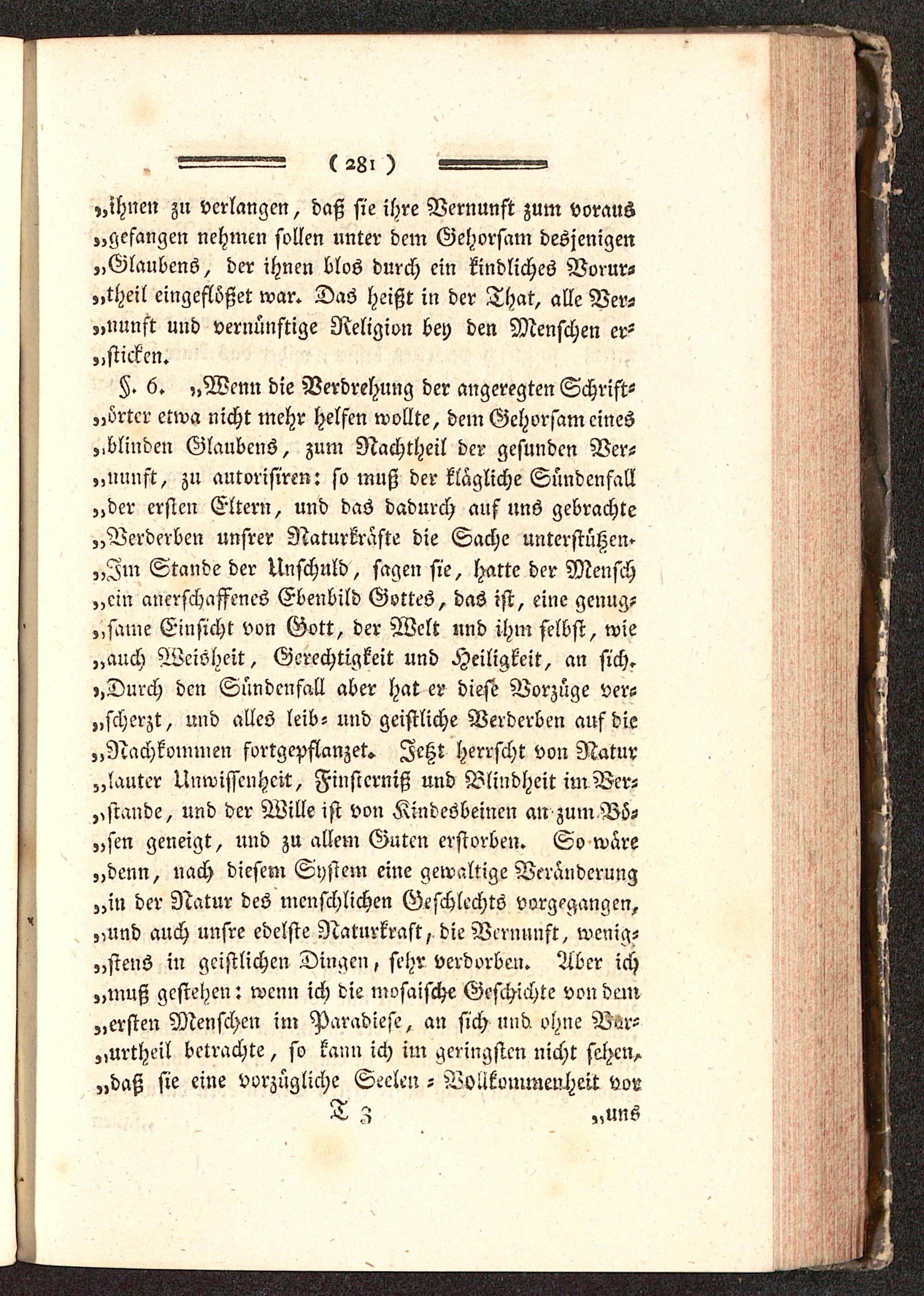 §. 6. „Wenn die Verdrehung der angeregten Schrift«„örtcr etwa nicht mehr helfen wollte, dem Gehorsam eines„blinden Glaubens, zum Nachtheil der gefunden Ver-„nnnft, zu autorisiren: so muß der klägliche Sündenfall„der ersten Eltern, und das dadurch auf uns gebrachte„Verderben unsrer Naturkrafte die Sache unterstützen-„Im Stande der Unschuld, sagen sie, hatte der Mensch„ein ancrschaffenes Ebenbild Gottes , das ist, eine genug-,,same Einsicht von Gott, der Welt und ihm selbst, wie„auch Weisheit, Gerechtigkeit und Heiligkeit, an sich.,,Durch den Sündcnfall aber hat er diese Vorzüge ver-scherzt, und alles leib- und geistliche Verderben auf die„Nachkommen fortgepflanzet» Jetzt herrscht von Natur„lauter Unwissenheit, Finsterniß und Blindheit im Ver-stände, und der Wille ist von Kindesbeinen an zum Bö-„sen geneigt, und zu allem Guten erstorben. So wäre„denn, nach diesem System eine gewaltige Veränderung„in der Natur des menschlichen Geschlechts vorgegangen,„und auch unsre edelste Naturkrast, die Vernunft, wenig-„stens in geistlichen Dingen, sehr verdorben. Aber ich„muß gestehen: wenn ich die mosaische Geschichte von dem„ersten Menschen im Paradiese, an sich und ohne V>U'-,.urtheil betrachte, so kann ich im geringsten nicht sehen,„daß sie eine vorzügliche Seelen - Vollkommenheit vov