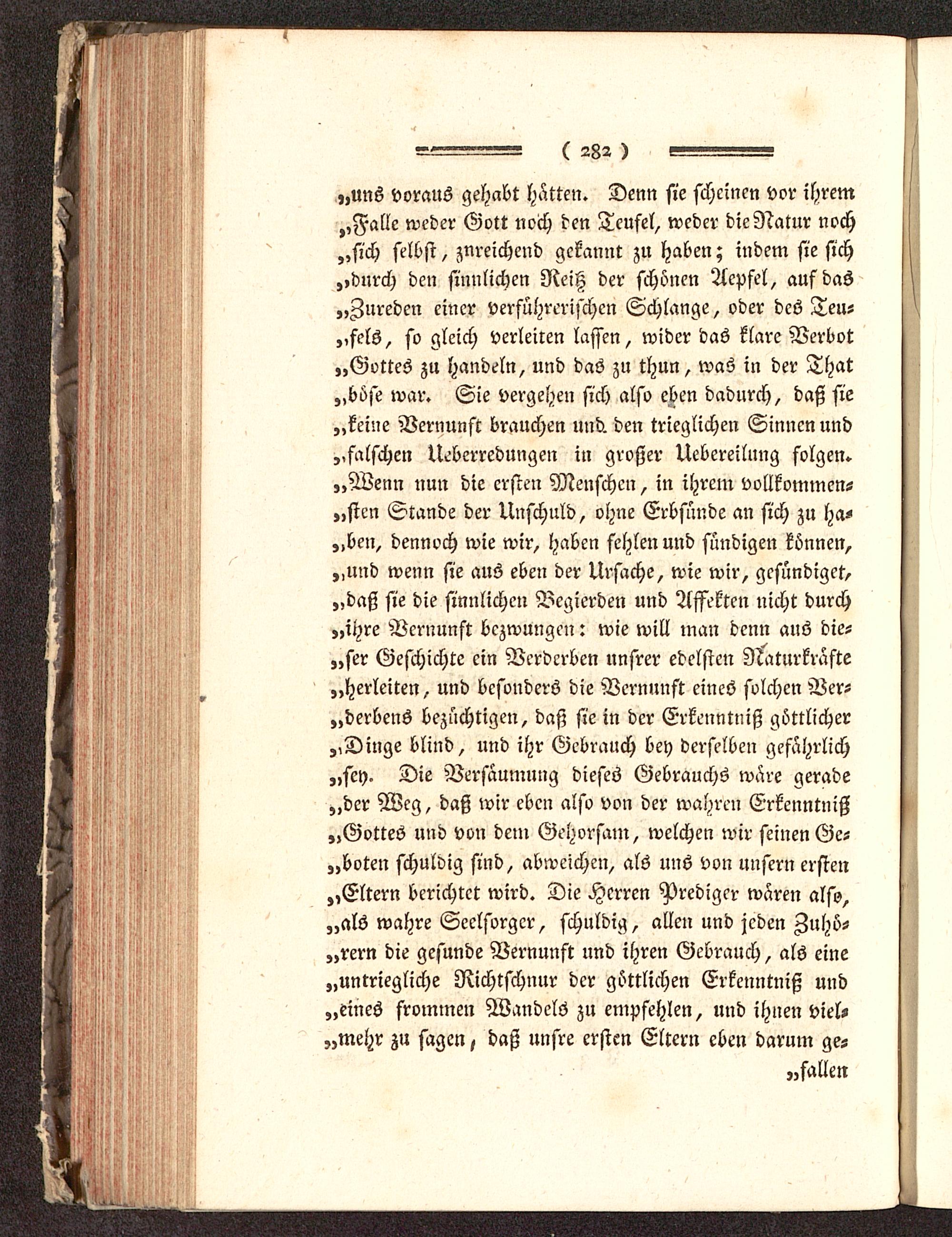 „uns voraus gehabt hatten. Denn sie scheinen vor ihrem,,Falle weder Gott noch den Teufel, weder die Natur noch„sich selbst, zureichend gekannt zu haben; indem sie sichdurch den sinnlichen Reitz der schönen Aepfel, auf das„Aureden einer verführerischen Schlange, oder des Teu-„felö, so gleich verleiten lassen, wider das klare Verbot„Gottes zu handeln, und das zu thun, was in der That„böse war. Sie vergehen sich also eben dadurch, daß sie„keine Vernunft brauchen und. den trieglichen Sinnen und,.falschen Ueberredungen in großer Uebereilung folgen.„Wenn nun die ersten Menschen, in ihrem vollkommcn-„sten Stande der Unschuld, ohne Erbsünde an sich zu ha-„ben, dennoch wie wir, haben fehlen und sündigen können,„und wenn sie aus eben der Ursache, wie wir, gesündiget,„daß sie die sinnlichen Begierden und Affekten nicht durch„ihre Vernunft bezwungen: wie will man denn aus die-„ser Geschichte ein Verderben unsrer edelsten Naturkrafte„herleiten, und besonders die Vernunft eines solchen Ver-„derbens bezüchtigen, daß sie in der Erkenntniß göttlicher,,Dinge blind, und ihr Gebrauch bey derselben gefährlich„sey. Die Verfäumung dieses Gebrauchs wäre gerade„der Weg, daß wir eben alfo von der wahren Erkenntniß„Gottes und von dem Gehorsam, welchen wir seinen Ge-„boten schuldig sind, abweichen, als uns von unsern ersten„Eltern berichtet wird. Die Herren Prediger wären also,„als wahre Seelsorger, schuldig, allen und jeden Zuhö-rern die gesunde Vernunft und ihren Gebrauch, als eine„untriegliche Richtschnur der göttlichen Erkenntniß und„eines frommen Wandels zu empfehlen, und ihnen viel-mehr zu sagen, daß unsre ersten Eltern eben darum ge-fallen