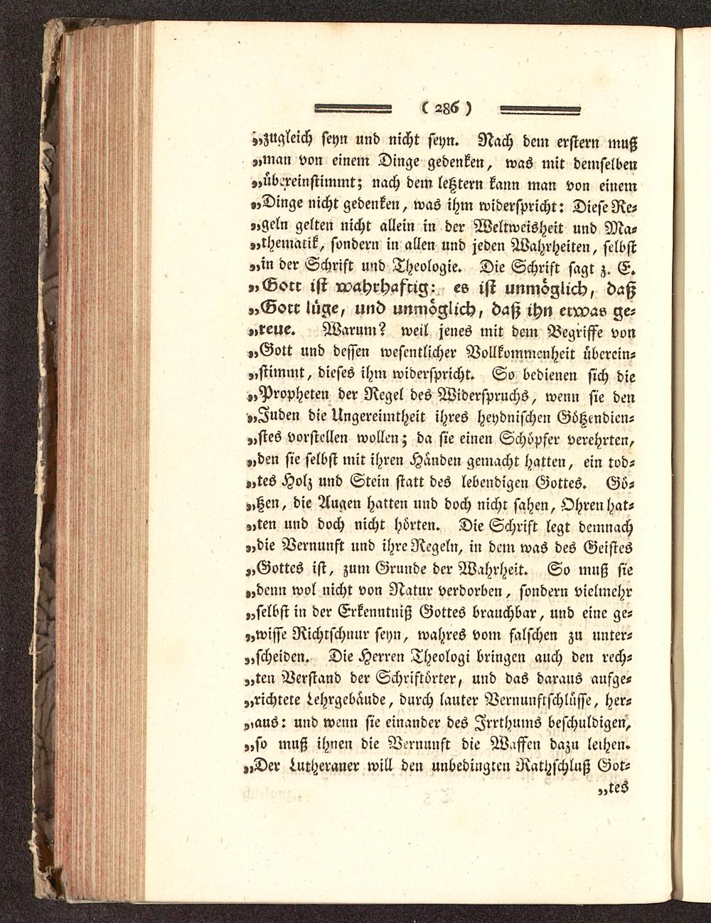 ^zugleich seyn und nicht seyn. Nach dem erster« muß„man von einem Dinge gedenken, was mit demselben„übereinstimmt; nach dem letztern kann man von einem„Dinge nicht gedenken, was ihm widerspricht: Diese Re-„geln gelten nicht allein in der Weltweisheit und Ma-thematik, sondern in allen und jeden Wahrheiten, selbst„in der Schrift und Theologie. Die Schrift sagt z. E.„Gorc ist wahrhaftig: es ist unmöglich, daß„Gorr lüge, und unmöglich, daß ihn erxvav ge-„reue. Warum? weil jenes mit dem Begriffe von„Gott und dessen wesentlicher Vollkommenheit übcrein-„stimmt, dieses ihm widerspricht. So bedienen sich die„Propheten der Negel des Widerspruchs, wenn sie den„Juden die Ungereimtheit ihres heydnischen Götztndicn-„stes vorstellen wollen; da sie einen Schöpfer verehrten,„den sie selbst mit ihren Handen gemacht hatten, ein tod-„tes Holz und Stein statt des lebendigen Gottes. Gö-„Hen, die Augen hatten und doch nicht sahen, Ohren hat-„ten und doch nicht hörten. Die Schrift legt demnach„die Vernunft und ihre Regeln, in dein was des Geistes„Gottes ist, zum Grunde der Wahrheit. So muß sie„denn wol nicht von Natur verdorben, sondern vielmehr„selbst in der Erkenntniß Gottes brauchbar, und eine ge-izwisse Richtschnur seyn, wahres vom falschen zu unter-„scheidcn. Die Herren Theologi bringen auch den rech-„ten Verstand der Schriftörter, und das daraus aufge-„richtere Lehrgebäude, durch lauter Vernunstschlüsse, her-„aus: und wenn sie einander des Irrthums beschuldigen,„so muß ihnen die Vernunft die Wisse" dazu leihen.„Der Lutheraner will den unbedingten Rathschluß Got-