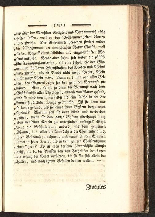 „tcs über der Menschen Seligkeit und Verdammniß nicht„gelten lassen, weil er den Vollkommenheiten Gottes„widerspricht Der Refonnirte hergcgen streitet wider,>die Mgegenwart der menschlichen Narur Christi, weil„sie den Begriff eines leiblichen und eingeschränkten We-„sens aufhebt. Bende aber setzen sich wider die päbsti-„sche Transsubstantiation, als eine Lehre, die den Sin-„nen und fühlbaren Eigenschaften des Brodts und Weins„widerspricht, als ob Brodt nicht mehr Brodt, Wein„nicht mehr Wein wäre. Dann ruft man von allen Sei-„ten, des Gegners Lehre sey der gesunden Vernunft zu-,,wider. Nun, so ist ja denn die Vernunft nach dem„Geständnisse aller Theologen, annoch von Natur gesund,„und sie wird von ihnen selbst als eine solche in der Er-kenntniß göttlicher Dinge gebraucht. Ist sie denn nur„so lange gesund, als sie eines jeden System beyzutreren„scheinet? Warum soll sie denn blind und verdorben„hcissen, wenn sie das ganze System überhaupt nach„eben denselben Regeln zu untersuchen anfängt? Wozu„dient die Beschuldigung anders, als dem gemeinen„Manne, d. i allen die keine Lehrer der Christenheit sind,„ihren Gebrauch zu nehmen, und einen blinden Glauben„sowol in jeder Secte, als in dem ganzen Christenthnme„einzuführen? Es ist eben derselbe hierarchische Kunst-„griff, als da die Pfaffen bey den Catholiken den Layen„die Lesung der Bibel verbieten, die sie für sich allein be-„halten, und nach ihrem Gefallen deuten wollen. —