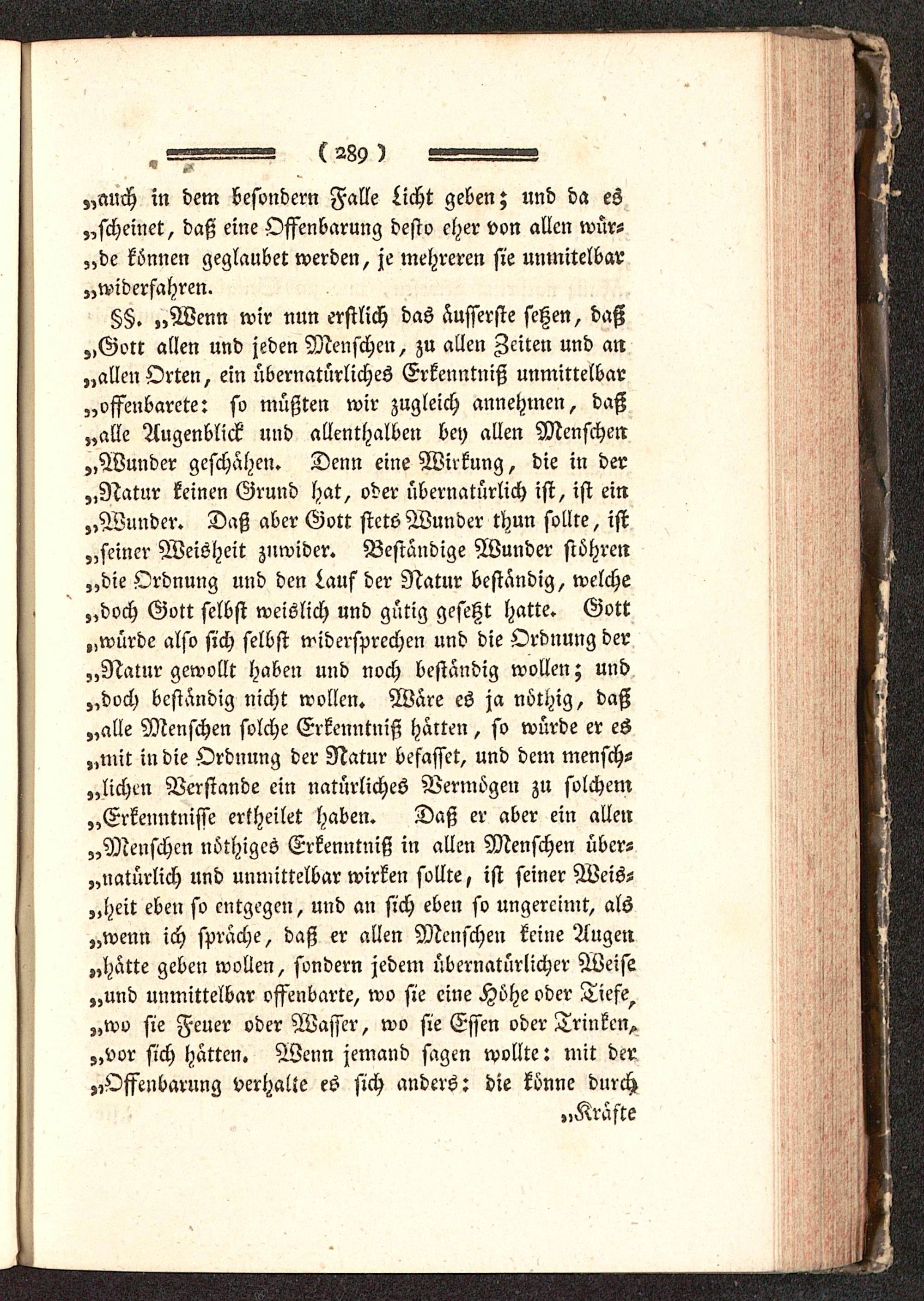 §§. „Wenn wir nun erstlich das äusserste setzen, daß„Gott allen und jeden Menschen, zu allen Zeiten und an„allen Orten, ein übernatürliches Erkenntniß unmittelbar„offenbarere: so müßten wir zugleich annehmen, daß„alle Augenblick und allenthalben bey allen Menschen„Wunder geschähen. Denn eine Wirkung, die in der„Natur keinen Grund hat, oder übernatürlich ist, ist ein„Wunder. Daß aber Gott stets Wunder thun sollte, ist„seiner Weisheit zuwider. Beständige Wunder siöhren„die Ordnung und den Lauf der Natur beständig, welche„doch Gott selbst weislich und gütig gesetzt hatte. Gott „würde also sich selbst widersprechen und die Ordnung der„Natur gewollt haben und noch bestandig wollen; und„doch beständig nicht wollen. Wäre es ja nöthig, daß„alle Menschen solche Erkenntniß halten, so würde er es„mit in die Ordnung der Natur befasset, und dem mensch-lichen Verstände ein natürliches Vermögen zu solchem„Erkenntnisse ertheilet haben. Daß er aber ein allen„Menschen nöthiges Erkenntniß in allen Menschen über-natürlich und unmittelbar wirken sollte, ist seiner Weis-heit eben so entgegen, und an sich eben so ungereimt, als„wenn ich spräche, daß er allen Menschen keine Augen„hätte geben wollen, sondern jedem übernatürlicher Weise„und unmittelbar offenbarte, wo sie eine Höhe oder Tiefe^„wo sie Feuer oder Wasser, wo sie Essen oder Trinken,„vor sich hätten. Wenn jemand sagen wollte: mit der„Offenbarung verhalle es sich anders: die könne durch