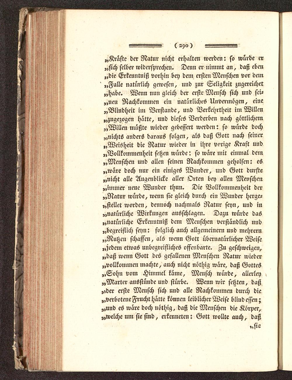 «Kräfte der Natur nicht erhalten werden: so würde er„sich selber widersprechen» Denn er nimmt an, daß eben„die Erkenntniß vorhin bey dein ersten Menschen vor dein' „Falle natürlich gewesen, und zur Seligkeit zugereichet„habe. Wenn nun gleich der erste Mensch sich und sei-„nm Nachkommen ein natürliches Unvermögen, eine„Blindheit im Verstände, und Verkehrtheit im Willen„zugezogen hätte, und dieses Verderben nach göttlichem„Willen müßte wieder gebessert werden: so würde doch„nichts anders daraus folgen, als daß Gott nach seiner„Weisheit die Natur wieder in ihre vorige Kraft und„Vollkommenheit setzen würde: so wäre mit einmal dem„Menschen und allen seinen Nachkommen geholfen: es„wäre doch nur ein einiges Wunder, und Gott durste„nicht alle Augenblicke aller Orten bey allen Menschen„immer neue Wunder thun. Die Vollkommenheit der„Natur würde, wenn sie gleich durch ein Wunder herge-„stellet worden, dennoch nachmals Natur seyn, und in„natürliche Wirkungen ausschlagen. Dazu würde das„natürliche Erkenntniß dem Menschen verständlich und„begreiflich seyn: folglich auch allgemeiner» und mehrern„Nutzen schaffen, als wenn Gott übernatürlicher Weise„jedem etwas unbegreifliches offenbarte. Au geschweigen,„daß wenn Gott des gefallenen Menfchen Natur wieder„vollkommen machte, auch nicht nöthig wäre, daß Gottes„Sohn vom Himmel käme, Mensch würde, allerley„Marter ausstünde und stürbe. Wenn wir setzten, daß,,der erste Mensch sich und alle Nachkommen durch die„verbotene Frucht hätte können leiblicher Weife blind essen;z,und es wäre doch uöthig, daß die Menfchen die Körper,,»welche um sie sind, erkenneten: Gott wollte auch, daß