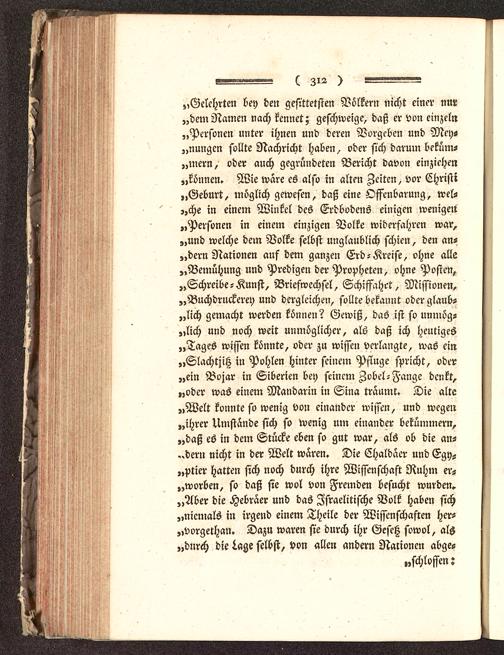 „Gelehrten bey den gesittetsten Völkern nicht einer nur„dem Namen nach kennet; geschweige, daß er von einzeln„Personen unter ihnen und deren Vorgeben und Meys„nungen sollte Nachricht haben., oder sich darum beküm-„mern, oder auch gegründeten Bericht davon einziehen„können. Wie wäre es also in alten Zeiten, vor Christi„Geburt, möglich gewesen, daß eine Offenbarung, wel-„che in einem Winkel des Erdbodens einigen wenigen„Personen in einem einzigen Volke widerfahren war,„und welche dem Volke selbst unglaublich schien, den an-„dern Nationen auf dem ganzen Erd-Kreise, ohne alle„Bemühung und Predigen der Propheten, ohne Posten,„Schreibe-Kunst, Briefwechsel, Schiffahrt, Missionen,„Buchdruckerey und dergleichen, sollte bekannt oder glaub-lich gemacht werden können? Gewiß, das ist so unmög-„lich und noch weit unmöglicher, als daß ich heutiges„Tages wissen könnte, oder zu wissen verlangte, was ein„Slachtjitz in Pohlen hinter seinem Pfluge spricht, oder„ein Bojar in Siberien bey seinem Zobel-Fange denkt,„oder was einem Mandarin in Sina träumt» Die alte„Welt konnte so wenig von einander wissen, und wegen„ihrer Umstände sich so wenig um einander bekümmern,„daß es in dem Stücke eben so gut war, als ob die an-»der» nicht in der Welt wären. Die Chaldaer und Egy-„ptier hatten sich noch durch ihre Wissenschaft Nuhm er-„worben, so daß sie wol von Fremden besucht wurden»„Aber die Hebräer und das Israelitische Volk haben sich„niemals in irgend einem Theile der Wissenschaften her-vorgethan. Dazu waren sie durch ihr Gesetz sowol, als„durch die läge selbst, Von allen andern Nationen abge-schlossen: