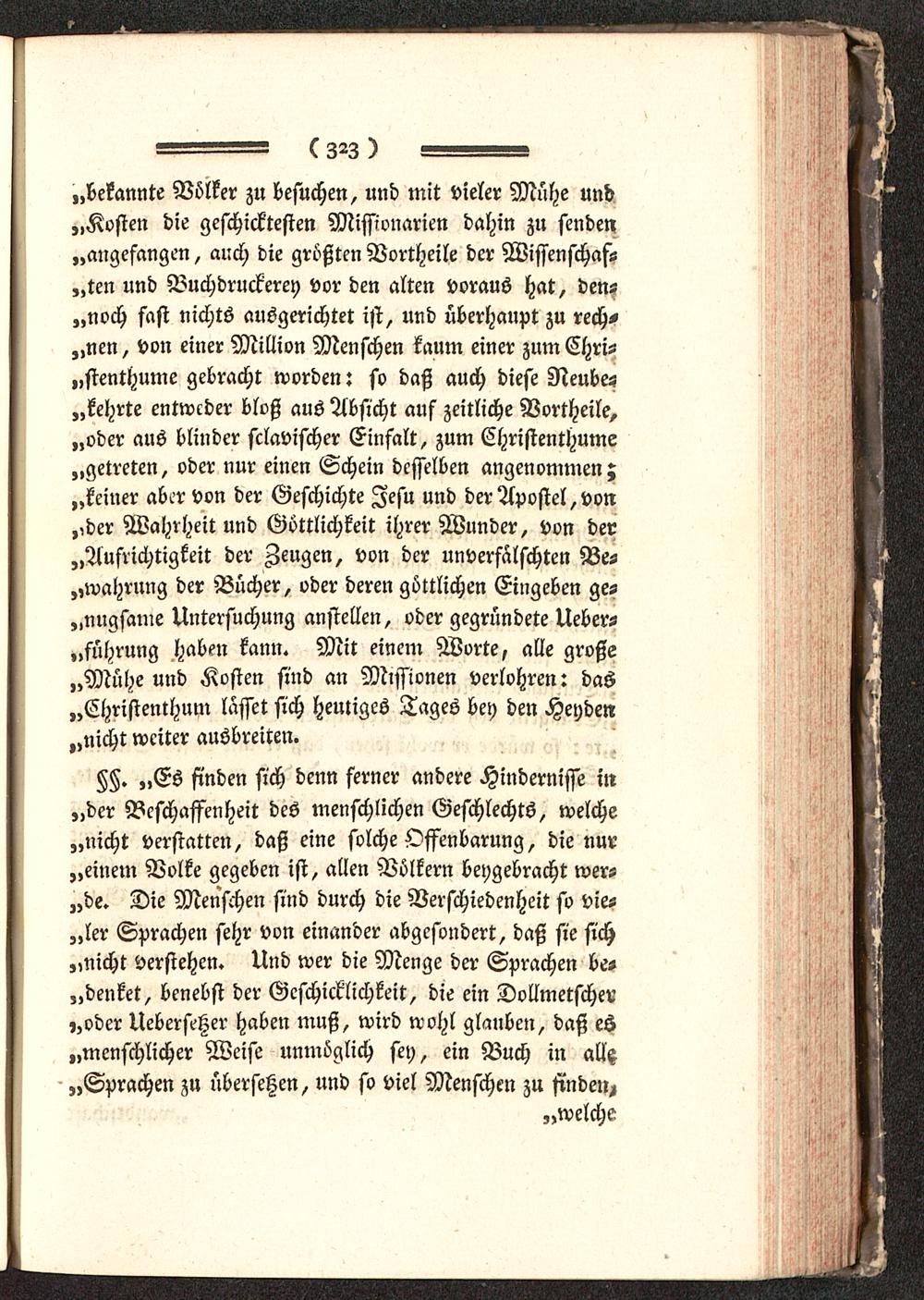 §§. „Es finden sich denn ferner andere Hindernisse in„der Beschaffenheit des menschlichen Geschlechts, welche„nicht verstatten, daß eine solche Offenbarung, die nur„einem Volke gegeben ist, allen Völkern beygebracht wer-„de. Die Menschen sind durch die Verschiedenheit so vie-„ler Sprachen sehr von einander abgesondert, daß sie sich„nicht verstehen. Und wer die Menge der Sprachen be-„denket, benebst der Geschicklichkeit, die ein Dollmetscher,,vder Uebersetzer haben muß, wird wohl glauben, daß es„menschlicher Weise unmöglich sey, ein Buch in alle.„Sprachen zu übersetzen, und so viel Menschen zu finden,