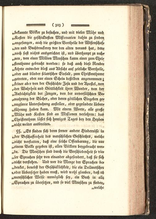 „bekannte Völker zu besuchen, und mit vieler Mühe und„Kosten die geschicktesten Misswnarien dahin zu senden„angefangen, auch die größten Vortheile der Wissenschafs„ten und Vuchdruckeren vor den alten voraus hat, den-„noch fast nichts ausgerichtet ist, und überhaupt zu rech-„nen, von einer Million Menschen kaum einer zum Chri-„stenthume gebracht worden: so daß auch diefe Neube-„kehrte entweder bloß aus Absicht auf zeitliche Vortheile,„oder ans blinder sclavischer Einfalt, zum Christenthume„getreten, oder nur einen Schein desselben angenommen;„keiner abcr von der Geschichte Jesu und der Apostel, von,,der Wahrheit und Göttlichkeit ihrer Wunder, von der„Aufrichtigkeit der Zeugen, von der unverfälschten Ve-rwahrung der Bücher, oder deren göttlichen Eingeben ge-„nngsame Untersuchung anstellen, oder gegründete Ueber-„führung haben kann. Mit einem Worte, alle große„Mühe und Kosten sind an Missionen verlohren: das„Christenthum lasset sich heutiges Tages bey den Heyden„nicht weiter ausbreiten.