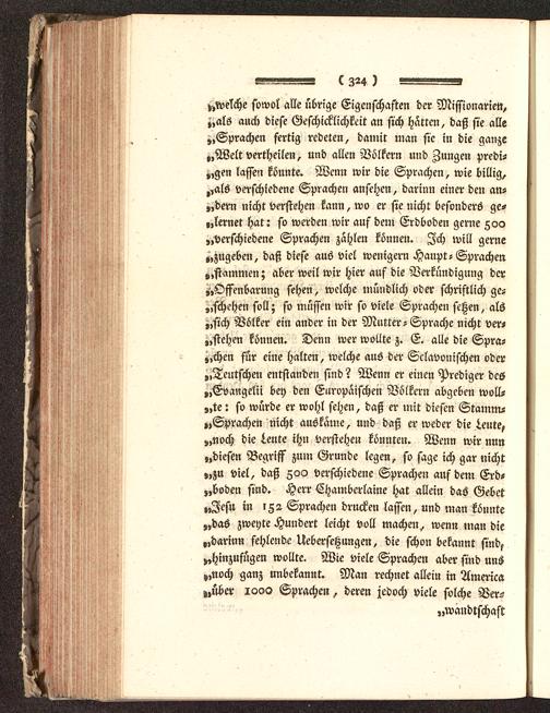 ».welche sowol alle übrige Eigenschaften der Missionarien,„als auch diese Geschicklichkeit an sich hätten, daß sie alle„Sprachen fertig redeten, damit man sie in die ganze„Welt vertheilen, und allen Völkern und Zungen predi-gen lassen könnte. Wenn wir die Sprachen, wie billig,,,als verschiedene Sprachen ansehen, darinn einer den an-„dern nicht verstehen kann, wo er sie nicht besonders ge-„lernet hat: so werden wir auf dem Erdboden gerne Zoo„verschiedene Sprachen zahlen können. Ich will gerne„zugeben, daß diese aus viel weniger» Haupt-Sprachen„stammen; aber weil wir hier auf die Verkündigung der».Offenbarung sehen, welche mündlich oder schriftlich ge-schehen soll; so müssen wir so viele Sprachen setzen, als„sich Völker ein ander in der Mutter-Sprache nicht ver-gehen können. Denn wer wollte z. E. alle die Spra-,,chen für eine halten, welche aus der Sclavonischen oder„Teutschen entstanden sind? Wenn er einen Prediger des„Evangelii bey den Europäischen Völkern abgeben woll-„te: so würde er wohl sehen, daß er mit diesen Stamn^„Sprachen nicht auskäme, und daß er weder die j.eute,„noch die leute ihn verstehen könnten. Wenn wir nun„diesen Begriff zum Grunde legen, so sage ich gar nicht„zu viel, daß Zoo verschiedene Sprachen auf dem Erd-„boden sind. Herr Chamberlaine hat allein das Gebet„Jesu in lZ2 Sprachen drucken lassen, und man könnte„das zweyte Hundert leicht voll machen, wenn man die„darinn fehlende Übersetzungen, die schon bekannt sind,„hinzufügen wollte. Wie viele Sprachen aber sind uns„noch ganz unbekannt. Man rechnet allein in America„über 1000 Sprachen, deren jedoch viele solche Ver-wandtschaft