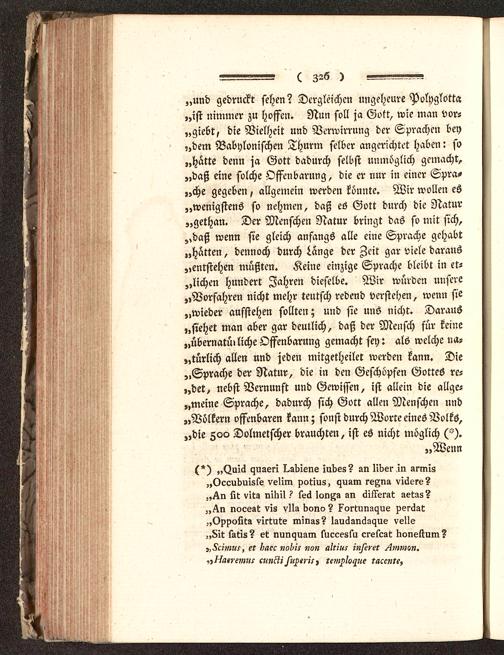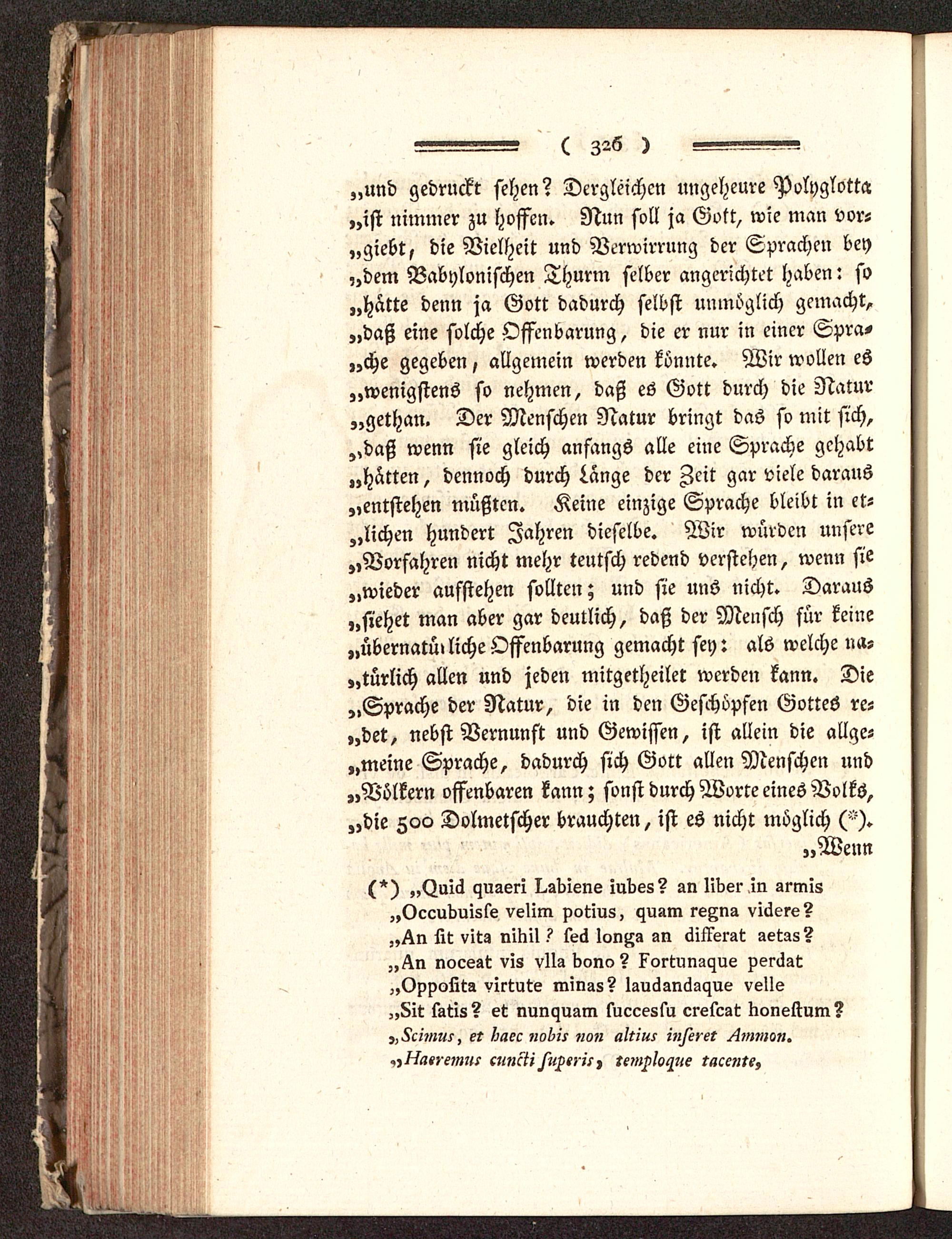 „und gedruckt sehen? Dergleichen ungeheure Polyglott«„ist nimmer zu hoffen. Nun soll ja Gott, wie man vor-„giebt, die Vielheit und Verwirrung der Sprachen bey„dem Babylonischen Thurm selber angerichtet haben: so„hätte denn ja Gott dadurch selbst unmöglich gemacht,„daß eine solche Offenbarung, die er nur in einer Spra-„che gegeben, allgemein werden konnte. Wir wollen es„wenigstens so nehmen, daß es Gott durch die Natur„gethan. Der Menschen Natur bringt das so mit sich,,,daß wenn sie gleich anfangs alle eine Sprache gehabt„hätten, dennoch durch Lange der Zeit gar viele daraus„entstehen müßten. Keine einzige Sprache bleibt in et-lichen hundert Jahren dieselbe. Wir würden unsere„Vorsahren nicht mehr tentfth redend verstehen, wenn sie„wieder aufstehen sollten; und sie uns nicht. Daraus„siehet man aber gar deutlich, daß der Mensch für keine„übernatmliche Offenbarung gemacht sey: als welche na-türlich allen und jeden mitgetheilet werden kann. Die„Sprache der Natur, die in den Geschöpfen GotteS re-„det, nebst Vernunft und Gewissen, ist allein die allge-„meine Sprache, dadurch sich Gott allen Menschen und„Völkern offenbaren kann; sonst durch Worte eines Volks,„die Zoo Dolmetscher brauchten, ist es nicht möglich