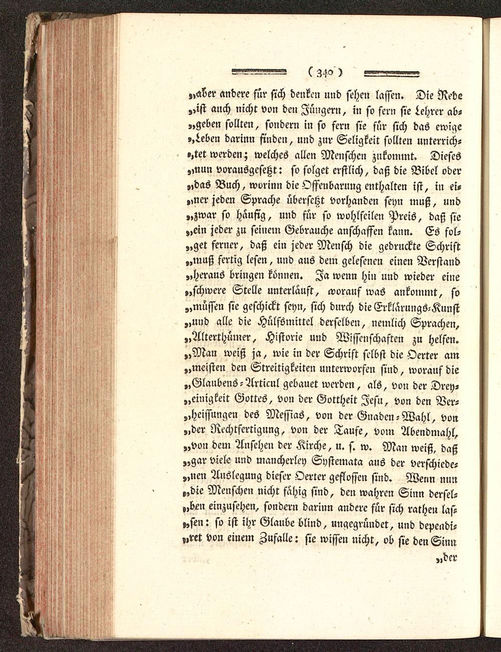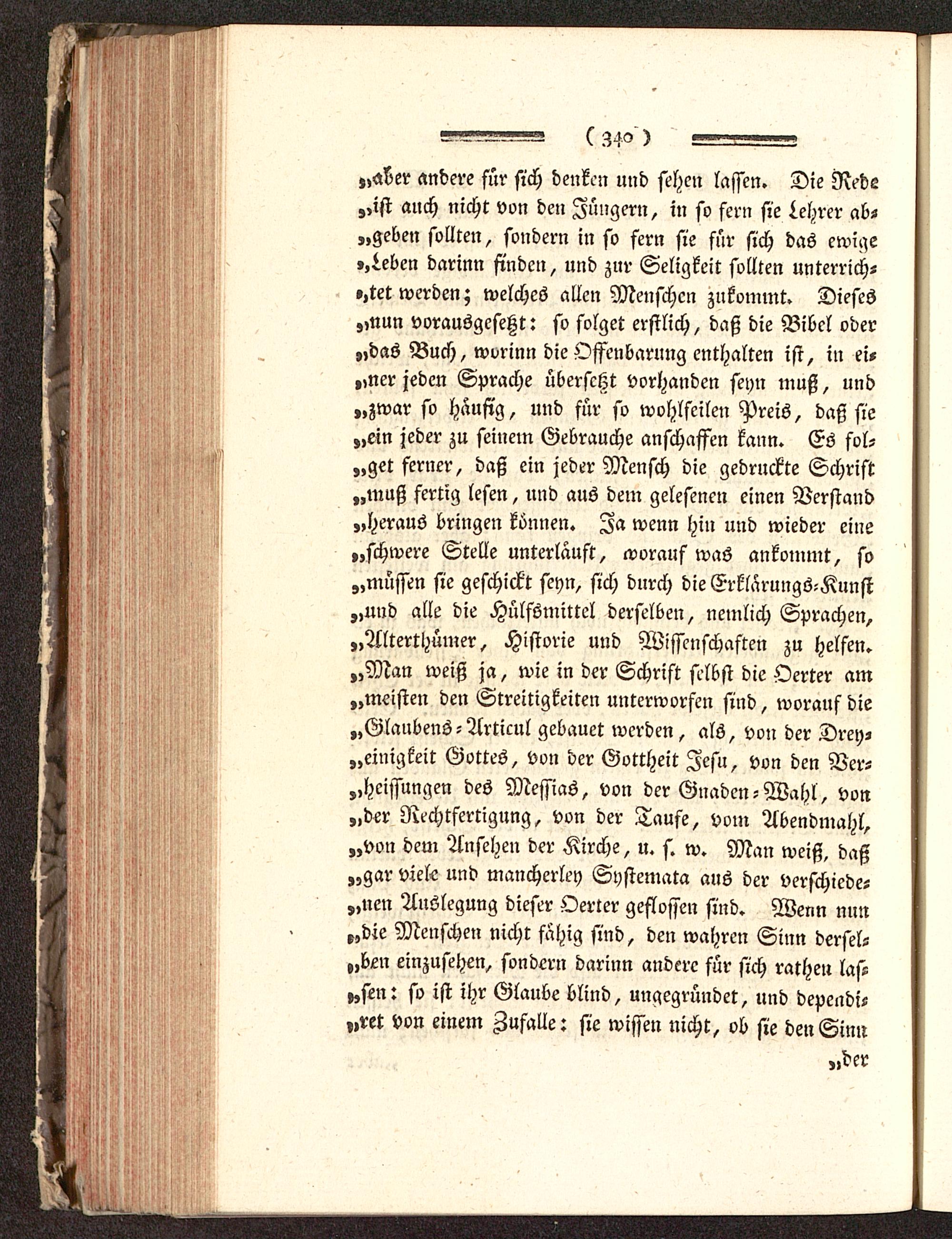 „aber andere für sich denkn, und sehen lassen. Die Rede,,ist auch nicht von den Jüngern, in so fern sie Lehrer ab->„geben sollten, sondern in so fern sie für sich das ewige».Leben darum finden, und zur Seligkeit sollten unterrich-tet werden; welches allen Menschen zukommt. Dieses„nun vorausgesetzt: so folget erstlich, daß die Bibel oder„das Buch, worinn die Offenbarung enthalten ist, in ei,„ner jeden Sprache übersetzt vorhanden seyn muß, und„zwar so hausig, und für so wohlfeilen Preis, daß sie„ein jeder zu seinem Gebrauche anschaffen kann. Es fol-„get ferner, daß ein jeder Menfch die gedruckte Schrift„muß fertig lesen, und aus dem gelesenen einen Verstand„heraus bringen können. Ja wenn hin und wieder eine„schwere Stelle unterlauft, worauf was ankommt, so„müssen sie geschickt seyn, sich durch dieErklarungs-Kunst„und alle die Hülfsmittel derselben, nemlich Sprachen,„Alterthümer, Historie und Wissenschaften zu helfen.„Man weiß ja, wie in der Schrift selbst die Oerter am„meisten den Streitigkeiten unterworfen sind, worauf die„Glaubens-Articul gebauet werden, als, von der Drey,„einigkeit Gottes, von der Gottheit Jesu, von den Ver-„heissungen des Messias, von der Gnaden-Wahl, von„der Rechtfertigung, von der Taufe, vom Abendmahl,„von dem Ansehen der Kirche, u. s. w. Man weiß, daß„gar viele und mancherley Systemata aus der verschiede-„nen Auslegung dieser Oerter geflossen sind. Wenn nun„die Menschen nicht fähig sind, den wahren Sinn dersel-ben einzusehen, sondern darinn andere für sich ratheu las-„sen: so ist ihr Glaube blind, unqegründet, und dependi-„ret von einem Zufalle: sie wissen nicht, ob sie den Sinn