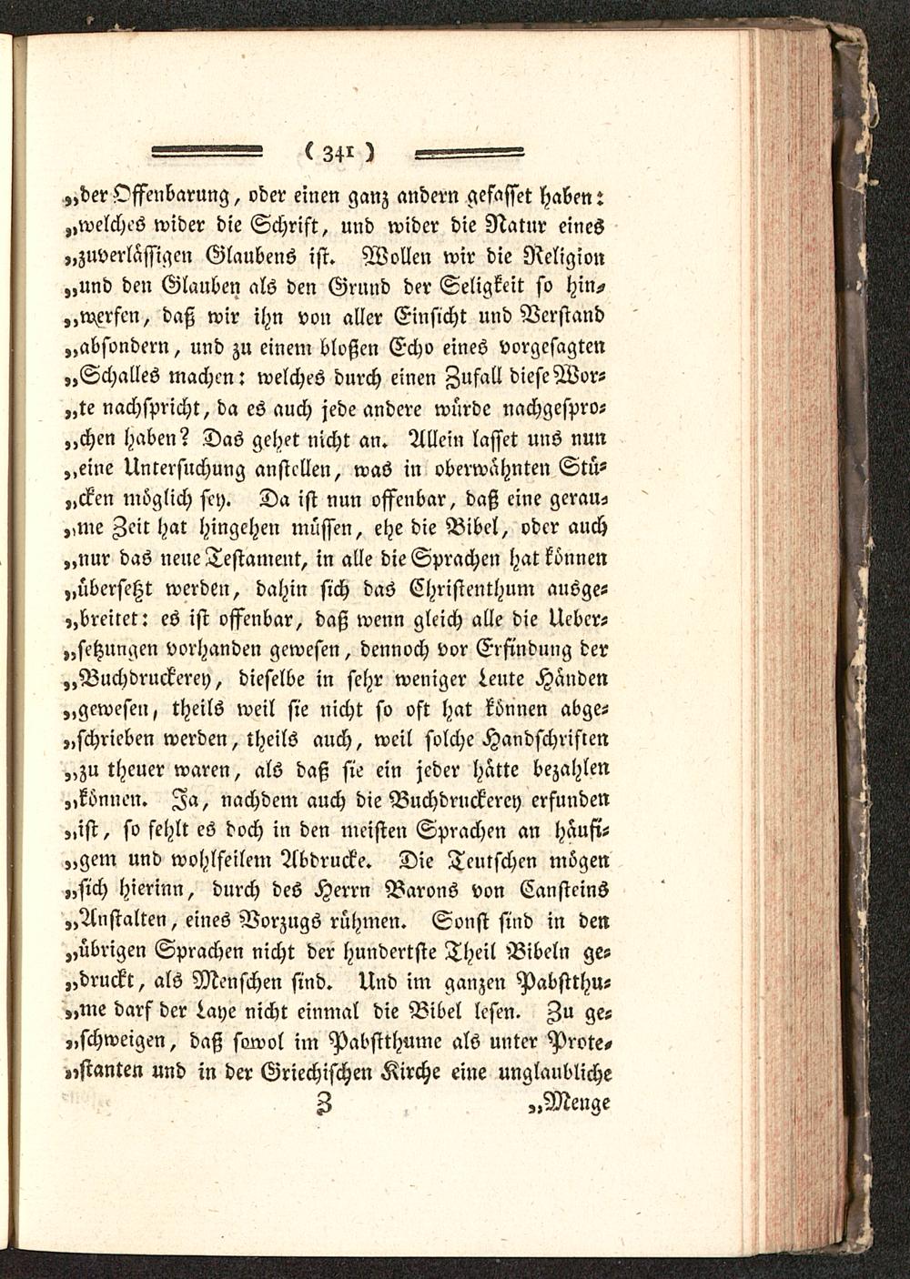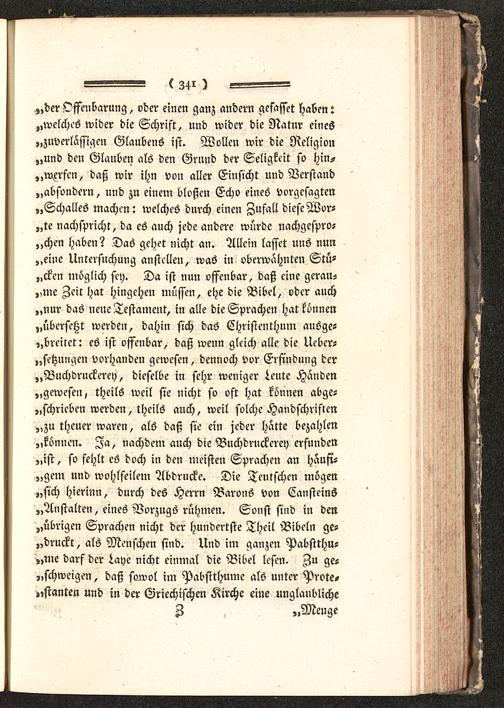 „der Offenbarung, oder einen ganz andern gefasset haben:„welches wider die Schrift, und wider die Natur eines„zuverlässigen Glaubens ist. Wollen wir die Religion„und den Glauben als den Grund der Seligkeit so hin-werfen, daß wir ihn von aller Einsicht und Verstand„absondern, und zu einem bloßen Echo eines vorgesagten„Schalles machen: welches durch einen Zufall diese Wor-„te nachspricht, da es auch jede andere würde nachgcspro-„chen haben? Das gehet nicht an. Allein lasset uns nun„eine Untersuchung anstellen, was in oberwahnten Stü-„cken möglich sey. Da ist nun offenbar, daß eine gerau--„me Zeit hat hingehen müssen, ehe die Bibel, oder auch„nur das ueue Testament, in alle die Sprachen hat können„übersetzt werden, dahin sich das Christenthum ausge-,,breiret: es ist offenbar, daß wenn gleich alle die Uebcr-„setzungen vorhanden gewesen, dennoch vor Erfindung der„Buchdruckerey, dieselbe in sehr weniger Leute Handen„gewesen, theils weil sie nicht so oft hat können abge-„schrieben werden, theils auch, weil solche Handschriften„zu theuer waren, als daß sie ein jeder hatte bezahlen„können. Ja, nachdem auch die Buchdruckerey erfunden„ist, so fehlt es doch in den meisten Sprachen an häufi-gem und wohlfeilem Abdrucke. Die Teutschen mögen„sich hierinn, durch des Herrn Barons von Cansteins„Anstalten, eines Vorzugs rühmen. Sonst sind in den„übrigen Sprachen nicht der hundertste Theil Bibeln ge-„druckt, als Menschen sind. Und im ganzen Pabstthu-„me darf der laye nicht einmal die Bibel lesen. Au ge-„schweigen, daß sowol im Pabstthume als unter Prote,„stanten und in der Griechischen Kirche eine unglaubliche