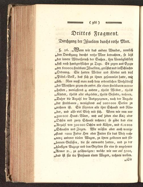 §. 26. „AAenn wir das andere Wunder, nemlich„den Durchgang durchs rothe Meer betrachten, so legt„der innere Widerspruch der Sachen, ihre Unmöglichkeit,,fast noch handgreiflicher zu Tage. Es zogen aus Egyp-„ten 600000 streitbare Jsraeliten, gerüstet und inSchlacht-„Ordnung. Sie hatten Weiber und Kinder und viel„Pöbel-Volk, das sich zu ihnen gesammlet hatte, mit„sich. Nun muß man nach dem ordentlichen Verhältniß„der Menschen gegen ein ander, für einen streitbaren mann-„hasten, wenigstens 4 andere, theils Weiber, theils„Kinder, theils alte abgelebte, theils Gesinde, rechnen.„Daher die Anzahl der Ausgezogenen, nach der 'Angabe„der streitbaren, wenigstens auf ^000 000 Seelen zu„rechnen ist. Sie sichreren alle ihre Schaafe und Rin-„dcr, und also viel Vieh mit sich. Wenn wir nun nur„Zoo000 Haus-Väter, und auf jeden eine Kuh oder„Ochsen und zwey Schaafe rechnen: so gäbe das eine„Anzahl von Zoo 000 Ochsen und Kühen, und 6^0000„Schaafen und Ziegen. Wir müssen aber auch wenig--,,stens 1 ooO Fuder Heu oder Futter für das Vieh rech-„nen; anderer vielen Wagen, zu ihren goldenen und sil-bernen Gefäßen, die sie entwandt hatten, und zu der„häufigen Bagage und den Gezelten für eine so ungeheure„Armee zc., zu geschweige«: welche wir nur auf 5000,„das ist für 60 Personen einen Wagen, rechnen wollen.