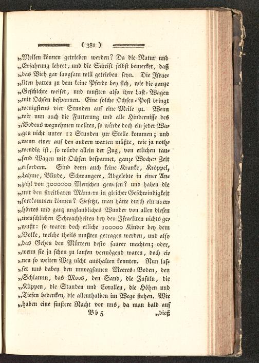 „Meilen können getrieben werden? Da die Natur und„Erfahrung lehret, und die Schrift selbst bemerket, daß„das Vieh gar langsam will getrieben seyn. Die Israe-„liten hatten zu dem keine Pferde bey sich, wie die ganze„Geschichte weiset, und mußten also ihre Last-Wagen„mit Ochsen bespannen. Eine solche Ochsen? Post dringt„wenigstens vier Stunden auf eine Meile zu. Wenn„wir nun auch die Fütterung und alle Hindernisse des„Bodens wegnehmen wollten, so würde doch ein jeder Wa-„gcn nicht unter i z Stunde» zur Stelle kommen; und„wenn einer auf den andern warten müßte, wie ja nollz-„wendig ist, so würde allein der Zug, von etlichen tau- '„send Wagen mit Ochsen bespannet, ganze Wochen Zeit„erfordern. Sind denn auch keine Kranke, Kröppel,„j,ahme. Blinde, Schwangere, Abgelebte in einer An-„zahl von ^000000 Menschen gew.sen? und haben die„mit den streitbaren Mann rn in gleicher Geschwindigkeit„fortkommen können? Gesetzt, man harte durch ein uner-„hörrcs und ganz unglaubliches Wunder von allen diesen„menschlichen Schwachheiten bey den Israeliten nichts ge-„wußt: so waren doch etliche 100000 Kinder bey dem„Volke, welche theils mußten getragen werden, und also„daS Gehen den Müttern desto saurer machten; oder,„wenn sie ja schon zu laufen vermögend waren, doch ei-„nen so weiten Weg nicht aushalten konnten. Nun las-„set uns dabey den unwegsamen Meeres-Boden, den„Schlamm, das Moos, den Sand, die Znsuln, die„Klippen, die Stauden und Corallen, die Höhen und„Tiefen bedenken, die allenthalben im Wege stehen. Wir»,haben eine finstere Nacht vor uns, da man bald auf