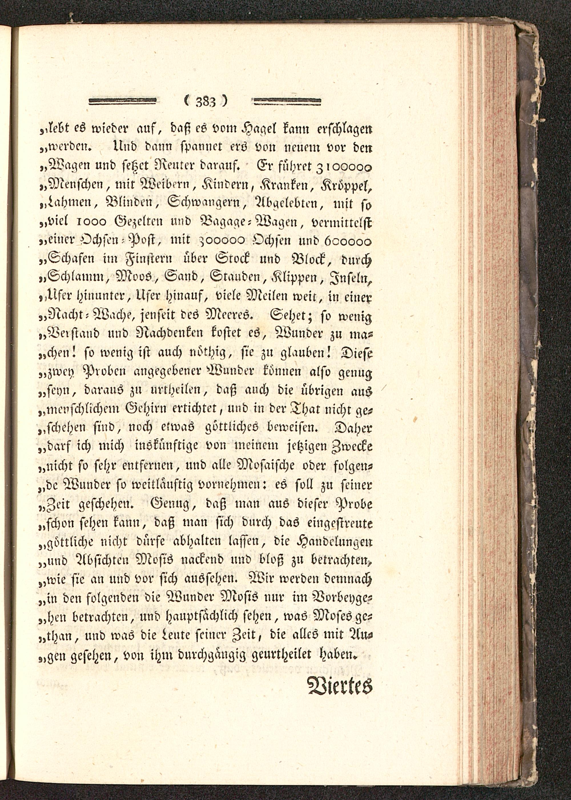 ,,lebt es wieder auf, daß es vom Hagel kann erschlagen„werden. Und dann spannet ers von neuem vor den„Wagen und sehet Neuler darauf. Er führet Z i OOooo„Menschen, mir Weilern, Kindern, Kranken, Kröppel,„Lahmen, Blinden, Schwangern, Abgelebten, mit so„viel looo Gezelren und Bagage-Wagen, vermittelst„einer Ochsen - Post, mit ^00000 Ochsen und 6^0000„Schafen im Finstern über Srock und Block, durch„Schlamm, Moos, Sand, Stauden, Klippen, Inseln,„Ufer hinunter, Ufer hinauf, viele Meilen weil, in einer„Nacht-Wache, jenfeit des Meeres. Sehet; so wenig„Beistand und Nachdenken kostet es, Wunder zu ma-„chen! so wenig ist auch nöthig, sie zu glauben! Diese„zwey Proben angegebener Wunder können also genug„seyn, daraus zu urtheilen, daß auch die übrigen aus„menschlichem Gehirn ertichter, und in der That nicht ge-schehen sind, noch etwas göttliches beweisen. Daher„darf ich mich inskünftige von meinem jetzigen Zwecke„nicht fo sehr entfernen, und alle Mofaifche oder folgen-„de Wunder so weitlauftig vornehmen: es soll zu seiner„Ant geschehen. Genug, daß man aus dieser Probe„schon sehen kann, daß man sich durch das eingestreute„göttliche nicht dürfe abhalten lassen, die Handelungen„und Absichten Mosis nackend und bloß zu betrachten^,„wie sie an und vor sich aussehen. Wir werden demnach„in den folgenden die Wunder MosiS nur im Vorbeyge-hen betrachten, und hauptsächlich sehen, was Moses gc-„than, und was die Leute seiner Zeit, die alles mit Aus„gen gesehen, von ihm durchgängig geurtheilet haben.
