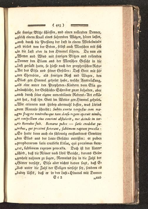 „So hatte denn auch ein schleunig entstandenes Gewitter„den Elias aus der Leute Gesichte entrissen: er pukes„propkergrum latis crccliclir küisae, czui s?roximu8 trete-„r-,t, suklimcm rssirum prcx.ellz. Doch ist der Unter-schied, daß die Römer nach Livii Bericht, daraus Gele-genheit nahmen zu sagen, Romulus sey in die Zahl der,,Götter versetzt, Elisa aber nichts davon sagt, daß E-,,lias unter die Zahl der Seligen versetzt sey, sondern es„dabey lasset, daß er in den Luft-Himmel mit Donner