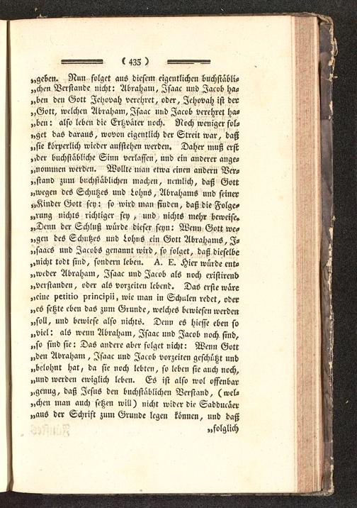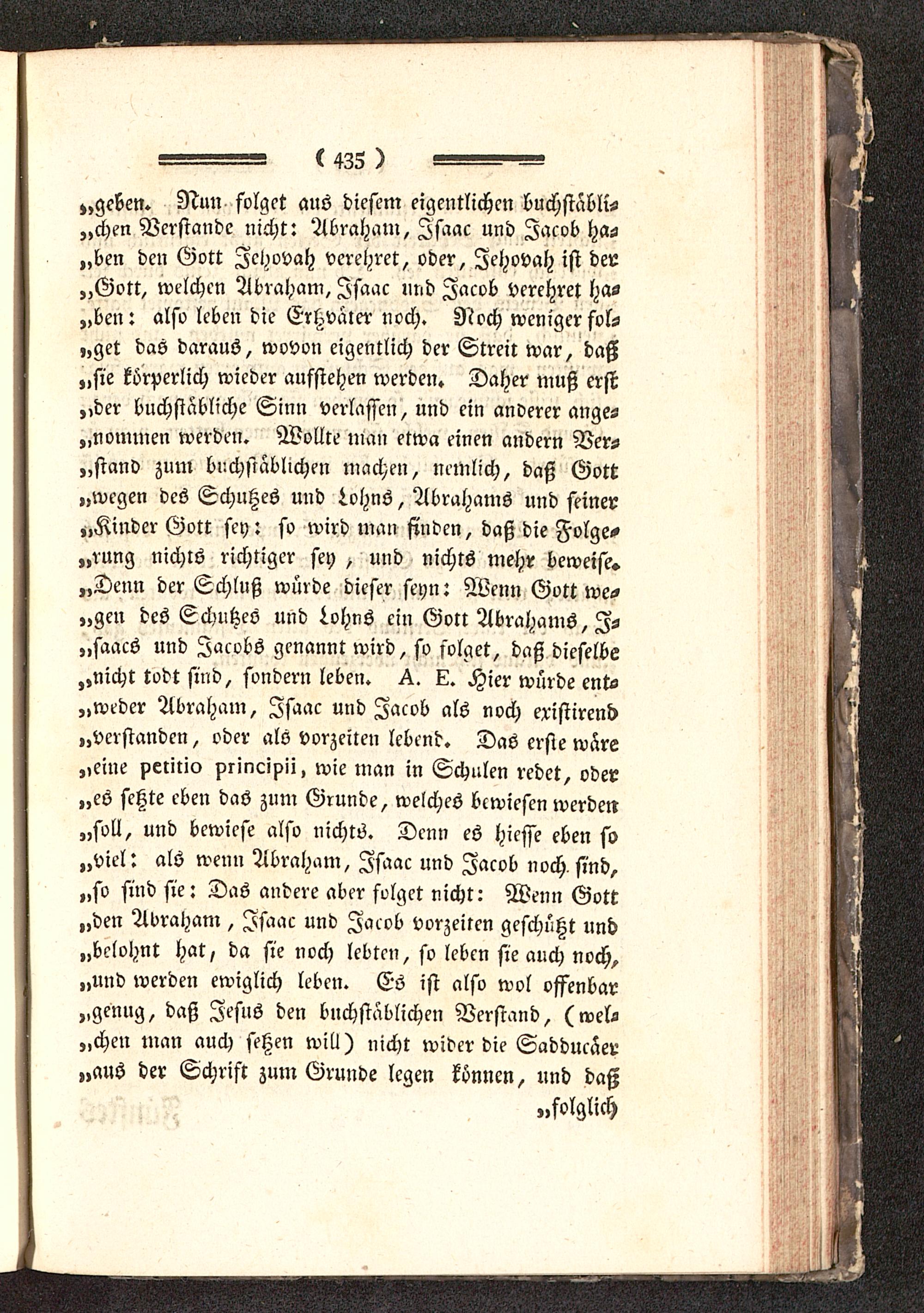 »»geben. Nun folget aus diesem eigentlichen buchstabli-„chen Verstände nicht: Abraham, Isaac und Jacob ha-„ben den Gott Jchovah verehret, oder, Zehovah ist der„Gott , welchen Abraham, Isaac m,d Jacob verehret ha-„ben: also leben die Ertzvaler noch. Noch weniger fols„get das daraus, wovon eigentlich der Streit war, daß„sie körperlich wieder aufstehen werden. Daher muß erst„der buchstabliche Sinn verlassen, und ein anderer anges„nommen werden. Wollte man etwa einen andern Vers„stand zum buchstäblichen machen, neMlich, daß Gott„wegen des Schutzes und Lohns, Abrahams und seiner„Kinder Gott sey: so wird man finden, daß die Folge-„rung nichts richtiger sey, und nichts mehr beweise»„Denn der Schluß würde dieser seyn: Wenn Gott we-„gen des Schutzes und Lohns ein Gott Abrahams , Zs„saacs und Jacobs genannt wird, so folget, daß dieselbe,,nicht todt sind, sondern leben. ^. Hier würde ento„weder Abraham, Isaac und Jacob als noch eMirend„Verstanden, oder als vorzeiten lebend. Das erste wäre„eine petino principii, wie man in Schulen redet, oder„es setzte eben das zum Grunde, welches bewiesen werden„soll, und bewiese also nichts. Denn es hiesse eben so„Viel: als wenn Abraham, Isaac und Jacob noch sind,„so sind sie: Das andere aber folget nicht: Wenn Gott „den Avraham , Isaac und Jacob vorzeiten geschützt und„belohnt hat, da sie noch lebten, so leben sie auch noch,„und werden ewiglich leben. Es ist also wol offenbargenug, daß Jesus den buchstäblichen Verstand, (wels„chen man auch setzen will) nicht wider die Sadducaer„aus der Schrift zum Grunde legen können, und daß