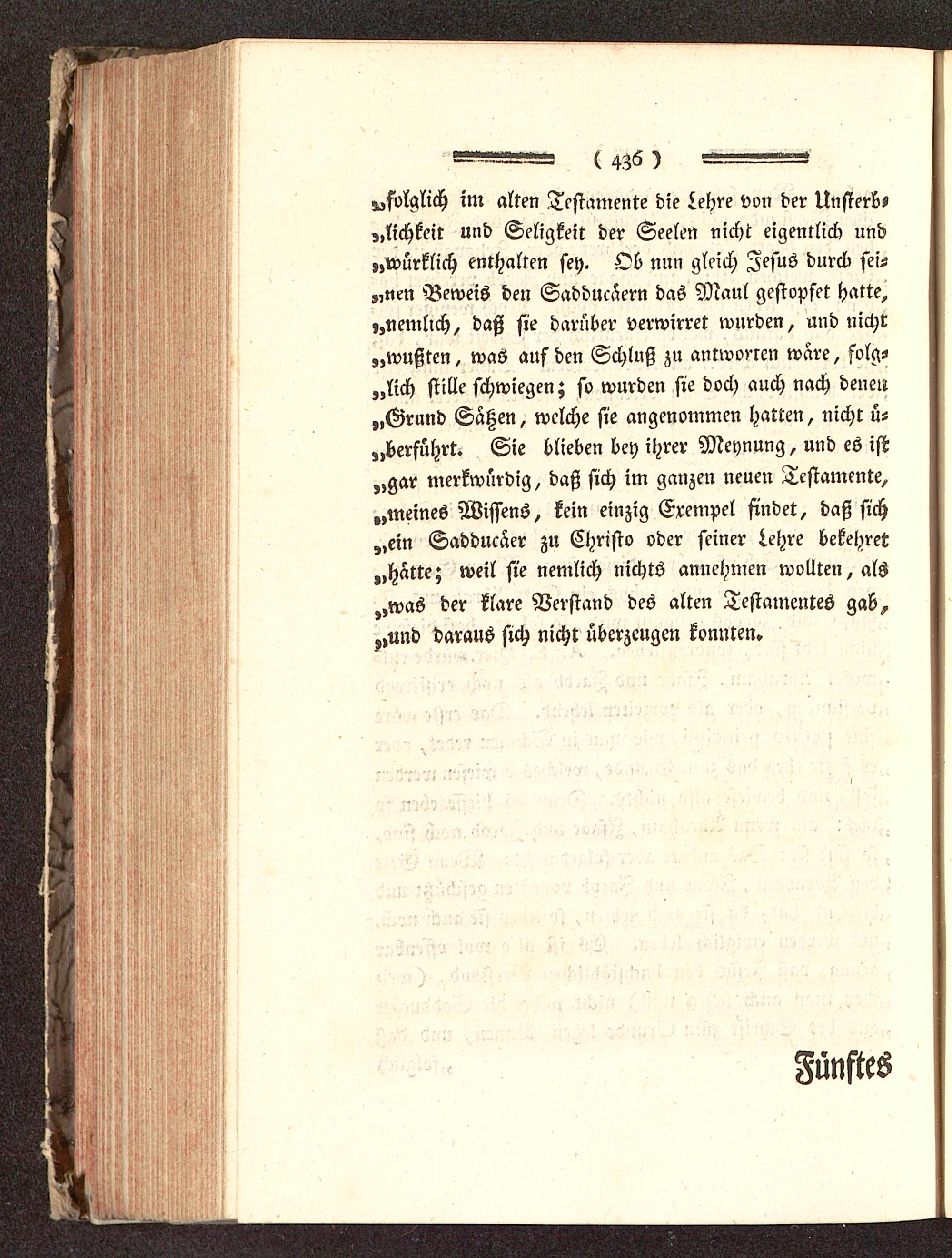 ^folglich im alten Testamente die Lehre von der Unsterb»„lichkeit und Seligkeit der Seelen nicht eigentlich und„würklich enthalten sey. Ob mm gleich Jesus durch sei-„nen Beweis den Sadducäern das Maul gestopfet hatte,,,nemlich, daß sie darüber verwirret wurden, und nicht„wußten, was auf den Schlnß zu antworten wäre, folg-lich stille schwiegen; so wurden sie doch auch nach deneit„Grund Sätzen, welche sie angenommen hatten, nicht ü-„berführt. Sie blieben bey ihrer Meynung, und es ist„gar merkwürdig, daß sich im ganzen neuen Testamente,„meines Wissens, kein einzig Erempel findet, daß sich„ein Sadducäer zu Christo oder seiner Lehre bekehret„hatte; weil sie nemlich nichts annehmen wollten, als„was der klare Verstand des alten Testamentes gab,,»und daraus sich nicht überzeugen konnten.