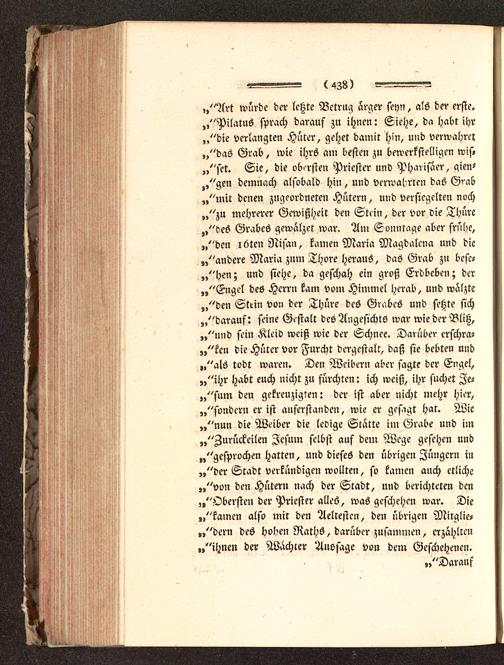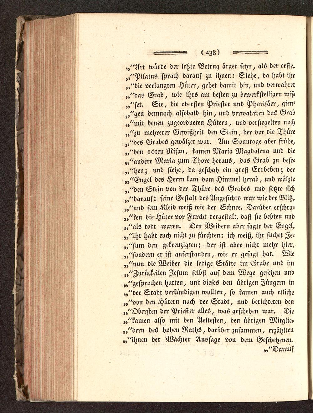 „"Art würde der letzte Betrug ärger seyn, als der erste.„"Pilatus sprach darauf zu ihnen: Siehe, da habt ihr„"die verlangten Hüter, gehet damit hin, und verwahret„"das Grab, wie ihrs am besten zu bewerkstelligen wis»,,"set. Sie, die obersten Priester und Pharisäer, gien-,,"gen demnach alsobald hin, und verwahrten das G^ab„"mir denen zugeordneten Hütern, und versiegelten noch„"zu mehrerer Gewißheit den Stein, der vor die Thüre„"des Grabes gewälzet war. Am Sonntage aber frühe,„"den löten Nisan, kamen Maria Magdalena und die„"andere Maria zum Thore heraus, das Grab zu bese-,,"hen; und siehe, da geschah ein groß Erdbeben; der„"Engel des Herrn kam vom Himmel herab, und wälzte„"den Stein von der Thüre des Grabes und setzte sich„"darauf: seine Gestalt des Angesichts war wie der Blitz,„"und sein Kleid weiß wie der Schnee. Darüber erschra-,,"ken die Hüter vor Furcht dergestalt, daß sie bebten und„"als todt waren. Den Weibern aber sagte der Engel,„"ihr habt euch nicht zu fürchten: ich weiß, ihr suchet Ze-„"sum den gekreuzigten: der ist aber nicht mehr hier,„"sondern er ist auferstanden, wie er ges'gt hat. Wie„"nun die Weiber die ledige Stätte im Grabe und im»"Zurückeilen Jesum selbst auf dem Wege gesehen und„"gesprochen hatten, und dieses den übrigen Jüngern in„"der Stadt verkündigen wollten, so kamen auch etliche„"von den Hütern nach der Scadt, und berichteten den„"Obersten der Priester alles, was geschehen war. Die„"kamen also mir den Aeltesten, den übrigen Mirglie«„"dern des hohen Raths, darüber zusammen, erzählten„"ihnen der Wachter Aussage von dem Geschehenen.