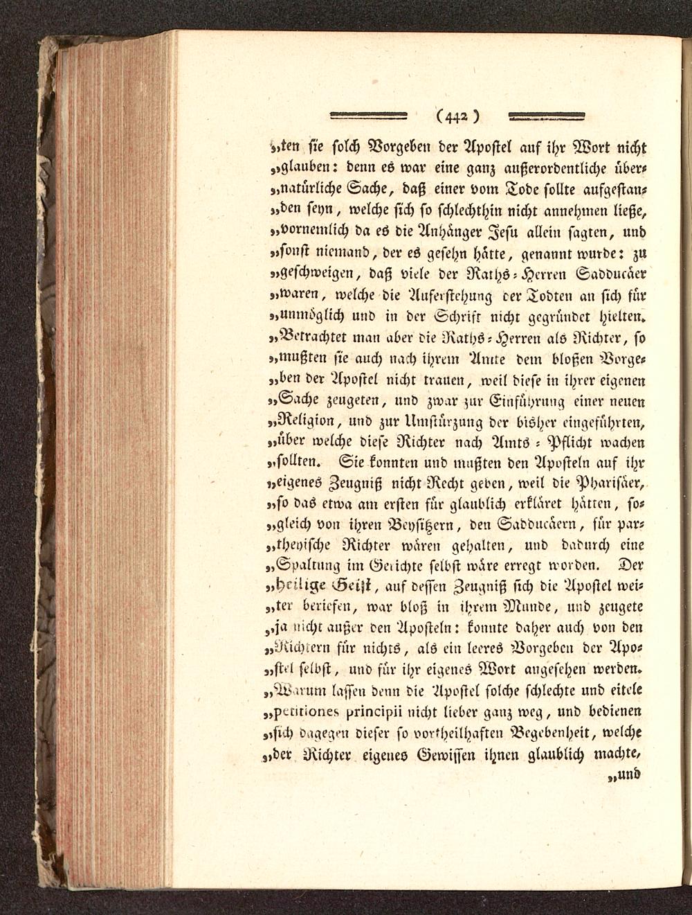 „ten sie solch Vorgeben der Apostel auf ihr Wort nicht,,glauben: denn es war eine ganz außerordentliche über«„natürliche Sache, daß einer vom Tode sollte aufgestan-den seyn, welche sich so schlechthin nicht annehmen ließe,„vornemlich da es die Anhänger Jesu allein sagten, und„sonst niemand, der es gesehn Härte, genannt wurde: zu„geschweige», daß viele der Raths-Herren Saddueaer„waren, welche die Auferstehung eer Todten an sich für„unmöglich und in der Schrift nicht gegründet hielten.„Betrachtet man aber die Raths - Herren als Riebrer, so„mußten sie auch nach ihrem Amte dem bloßen Borge«„ben der Apostel nicht trauen, weil diese in ihrer eigenen„Sache zeugeren, und zwar mr Einführung einer neuen„Religion, und zur Umstürzung der bisher eingeführten,„über welche diese Richter nach Amts - Pflicht wachen„sollten. Sie konnten und mußten den Aposteln auf ihr„eigenes Zeugniß nicht Recht geoen, weil die Pharisäer,„so das etwa am ersten für glaublich erklaret harren, so«„gleich von ihren Beysitzern, den Saddueaern, für par-teyische Richter wären gehalten, und dadurch eine„Spaltung im Ge.ichte selbst wäre erregt worden. Der„hellrote iLiei.'i, ans dessen Zeugniß sich die Apostel wei-„ter beriefen, war bloß in ihrem Munde, und zcugete,.ja »ichc außer den Aposteln: konnte daher auch von den„Rich-ern für nichts, als ein leeres Borgebcn der Apo-„stel selbst, und für ihr eigenes Wort angesehen werden.„Warum lassen denn die Apostel solche schlechte und eitele„riccirione!, t/rincirni nicht lieber ganz weg, und bedienen„sich dagegen dieser so vortheilhaftcn Begebenheit, welche„der Richter eigenes Gewissen ihnen glaublich machte,