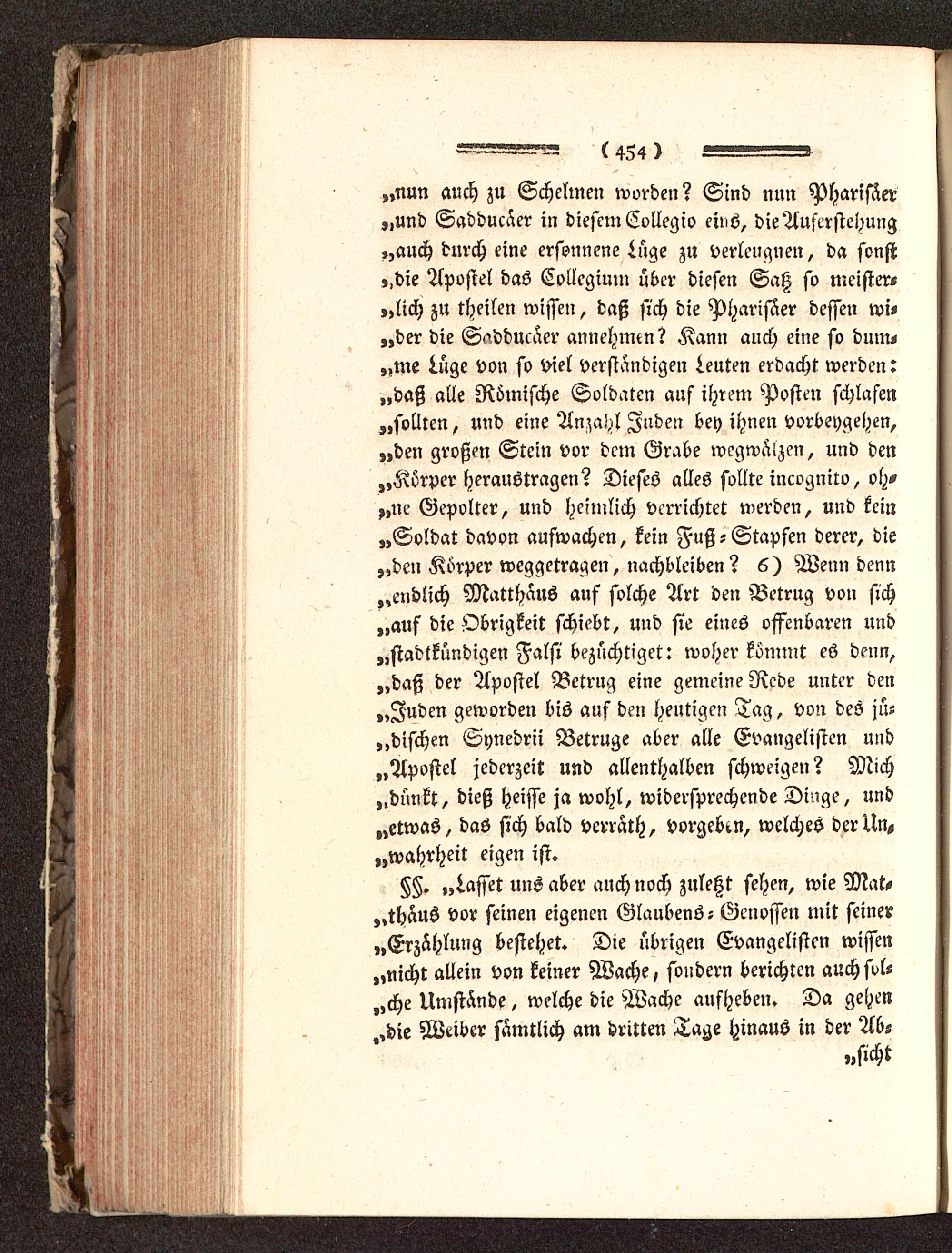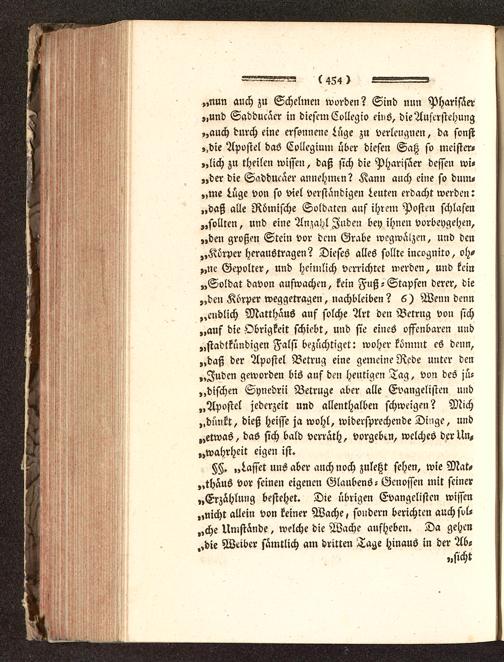 „NUN auch zu Schelmen worden? Sind nun Pharisäer„und Sadducäer in diesem Collegio eiiis, die Auferstehung,,auch durch eine ersonnene Lüge zu verleugnen, da sonst,,die Apostel das Collegium über diesen Saß so meister«„lich zu theilen wissen, daß sich die Pharisäer dessen wi,„der die Saddueäer annehmen? Kann auch eine so duin«„me Lüge von so viel verständigen Leuten erdacht werden:„daß alle Römische Soldaten auf ihrem Posten schlafen„sollten, und eine Anzahl Juden bey ihnen Vorbeygehen,„den großen Stein vor dem Grabe wegwäizen, und den„Körper heraustragen? Dieses alles sollte incognito, oh-„ne Gepolter, und heimlich verrichtet werden, und kein„Soldat davon aufwachen, kein Fuß-Stapfen derer, die„den Körper weggetragen, nachbleiben? 6) Wenn denn„endlich Matthäus auf solche Art den Betrug von sich„auf die Obrigkeit schiebt, und sie eines offenbaren und„stadtkündigen Falsi bezüchtiget: woher kömmt es denn,„daß der Apostel Betrug eine gemeine Rede unter den„Juden geworden bis auf den heutigen Tag, von des jü-dischen Synedrii Betrüge aber alle Evangelisten und„Apostel jederzeit und allenthalben schweigen? Mich„dünkt, dieß Heisse ja wohl, widersprechende Dinge, und„etwas, das sich bald verrath, vorgeben, welches der Un,„Wahrheit eigen ist.
