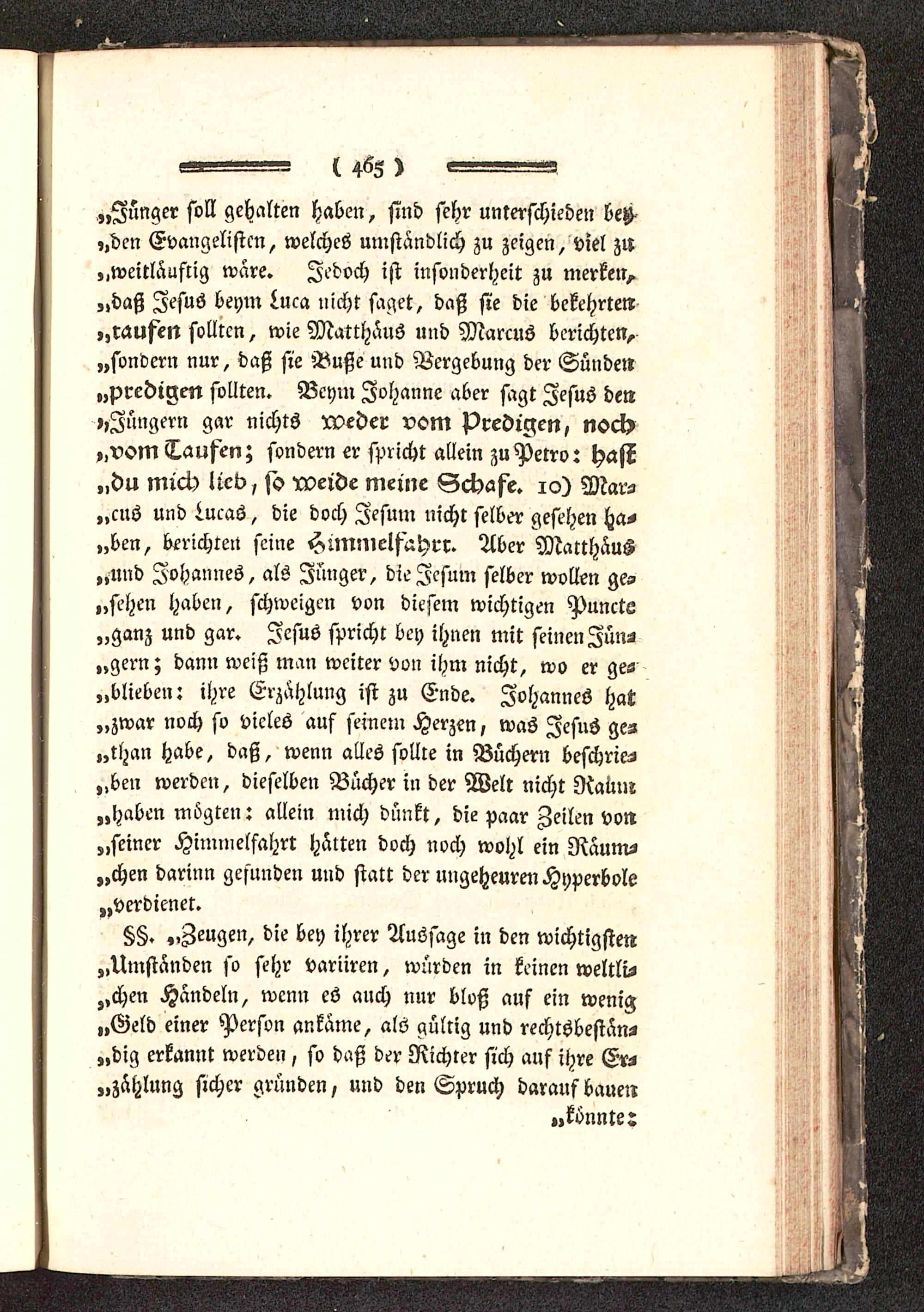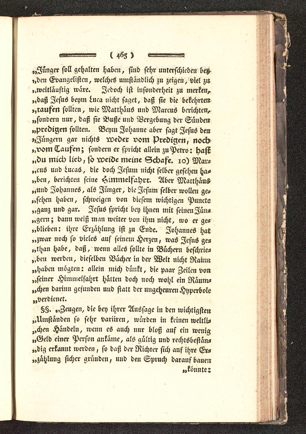 „Zünger soll gehalten haben, sind sehr unterschieden bG,,den Evangelisten, welches umständlich zu zeigen, viel zu„weilläustig wäre. Jedoch ist insonderheit zu merken,„daß Jesus beym Luca nicht saget, daß sie die bekehrten„mufett sollten, wie Matthäus und Marcus berichten,„sondern nur, daß sie Buße und Vergebung der Sünde»„predigen sollten. Beym Johanne aber sagt Jesus den»»Jüngern gar nichts nxder vom predigen, noch,,vom Taufen; sondern er spricht allein zuPetro: hast„du mich lieb, so rveide meine Schafe. 10) Mars„cns und Lucas, die doch Jesum nicht selber gesehen ha-„ben, berichten seine Hunmelfahrr. Aber Matthäus„und Johannes, als Junger, die Jesum selber wollen ge-„sehen haben, schweigen von diesem wichtigen Puncte„ganz und gar. Jesus spricht bey ihnen mit seinen Jüns„gern; dann weiß man weiter von ihm nicht, wo er ges„blieben: ihre Erzählung ist zu Ende. Johannes hat„zwar noch so vieles auf semem Herzen, was Jesus ges„than habe, daß, wenn alles sollte in Büchern beschrieb„ben werden, dieselben Bücher in der Welt nicht Raum„haben mögten: allein mich dünkt, die paar Zeilen von„seiner Himmelfahrt hätten doch noch wohl ein Räum-„chen darum gefunden und statt der ungeheuren Hyperbole„verdienet.