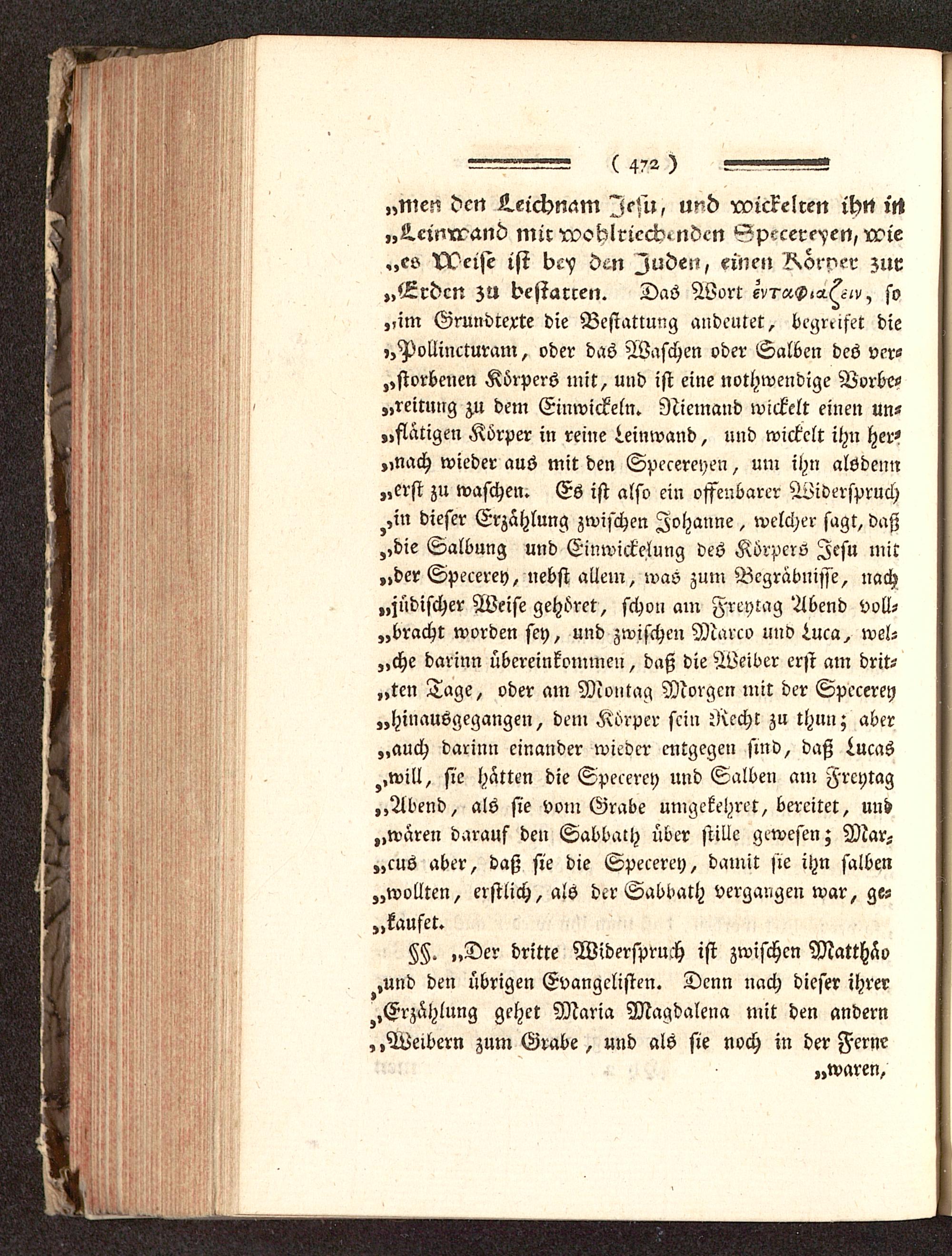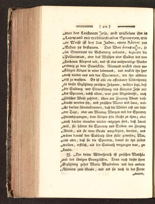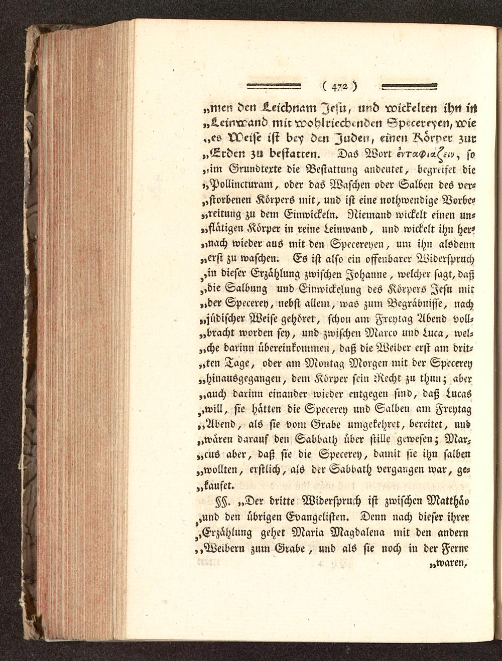 „im Grundrente die Bestattung andeutet, begreifet die,,Pollincturam, oder das Waschen oder Salben des ver-dorbenen Körpers mit, und ist eine nothwendige Vorbe-„reitnng zu dem Einwickeln. Niemand wickelt einen un-tätigen Körper in reine Leinwand, und wickelt ihn her-„nach wieder aus mit den Specereyen, um ihn alödeim„erst zu waschen. Es ist also ein offenbarer Widerspruch^,in dieser Erzählung zwischen Johanne, welcher sagt, daß„die Salbung und Einwickelung des Körpers Jesu mit„der Speeerey, nebst allem, was zum Begräbnisse, nach„jüdischer Weise gehöret, schon am Freytag Abend voll-bracht worden sey, und zwischen Marco und 4uca, wel-„che darum übereinkommen, daß die Weiber erst am drit-„ten Tage, oder am Montag Morgen mit der Specerey„hinausgegangen, dem Körper sein Recht zu thun; aber„auch darinn einander wieder entgegen sind, daß tucas,,will, sie hatten die Specerey und Salben am Krcytag„Abend, als sie vom Grabe umgekehret, bereitet, uud„waren darauf den Sabbath über stille gewesen; Mar-„cus aber, daß sie die Specerey, damit sie ihn salben„wollten, erstlich, als der Sabbath vergangen war, ge-„kaufet.