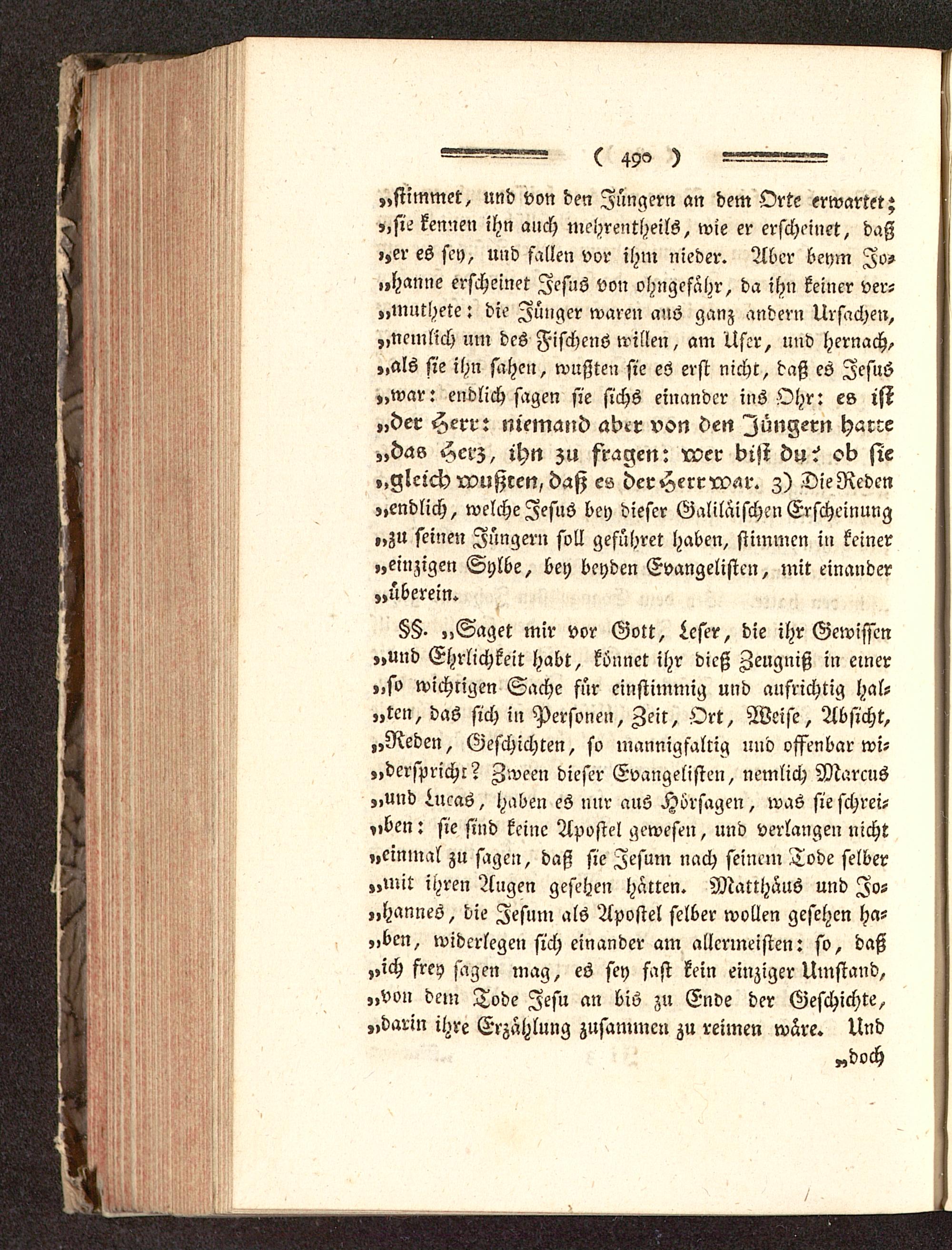 §§- „Saget mir vor Gott , Leser, die ihr Gewissen„und Ehrlichkeit habt, könnet ihr dieß Zeugniß in einer„so wichtigen Sache für einstimmig und aufrichtig hal-ben, das sich in Personen, Zeit, Ort, Weise, Absicht,„Reden, Geschichten, so mannigfaltig und offenbar wi-„dersprichr? Zween dieser Evangelisten, nemlich Marcns„und Lucas, haben es nur auS Horsagen, was sie schrei-ben : sie sind keine Apostel gewesen, und verlangen nicht«einmal zu sagen, daß sie Jesum nach seinem Tode selber„mit ihren Augen gesehen hätten. Matthäus und Jo-hannes, die Jesum als Apostel selber wollen gesehen ha-ben, widerlegen sich einander am allermeisten: so, daß,,ich frey sagen mag, es sey fast kein einziger Umstand,„von dem Tode Jesu an bis zu Ende der Geschichte,„darin ihre Erzählung zusammen zu reimen wäre. Und