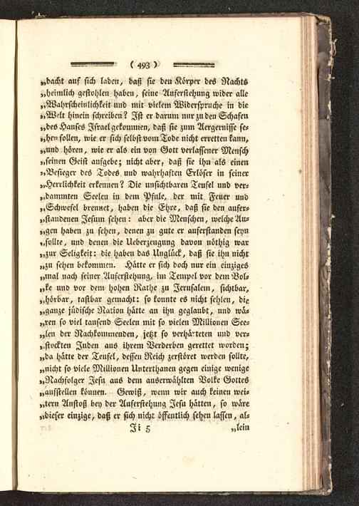 „dacht auf sich laden, daß sie den Körper des Nachts„heimlich gestohlen haben, seine Auferstehung wider alle„Wahrscheinlichkeit und mit vielem Widerspruche in die„Welt hinein schreiben? Ist er darum nur zu den Schafen„deö Hauses Israel gekommen, daß sie zum Aergernisse se-ihen sollen, wie er sich selbst vom Tode nicht erretten kann,„und hören, wie er als ein von Gott verlassener Menschk.seinen Geist aufgebe; nicht aber, daß sie ihn als einen„Besieger des Todes und wahrhaften Erlöser in seiner„Herrlichkeit erkennen? Die unsichtbaren Teufel und ver-dammten Seelen in dem Pfule, der mit Feuer und„Schwefel brennet, haben die Ehre, daß sie den aufer-„standenen Zefum sehen: aber die Menschen, welche Au-„gcn haben zu sehen, denen zu gute er auferstanden seyn„sollte, und denen die Ueberzeugung davon nöthig war„zur Seligkeit: die haben das Unglück, daß sie ihn nicht„zu sehen bekommen. Hatte er sich doch nur ein einziges„mal nach seiner Auferstehung, im Tempel vor dem Vol-„ke und vor dem hohen Rathe zu Jerusalem , sichtbar,„hörbar, rastbar gemacht: so konnte es nicht fehlen, die„ganze jüdische Naüon hatte an ihn geglaubt, und wä-„rcn so viel tausend Seelen mit so vielen Millionen See-„len der Nachkommenden, jetzt so verhärteten und ver-,.stockten Juden aus ihrem Verderben gerettet worden;„da hatte der Teufel, dessen Reich zerstöret werden sollte,„nicht so viele Millionen Unterthanen gegen einige wenige„Nachfolger Jesu aus dem auserwahlten Volke Gottes„aufstellen können. Gewiß, wenn wir auch keinen wei-„tern Anstoß bey der Auferstehung Jesu hatten, so wäre„dieser einzige, daß er sich nicht öffentlich sehen lassen, al-