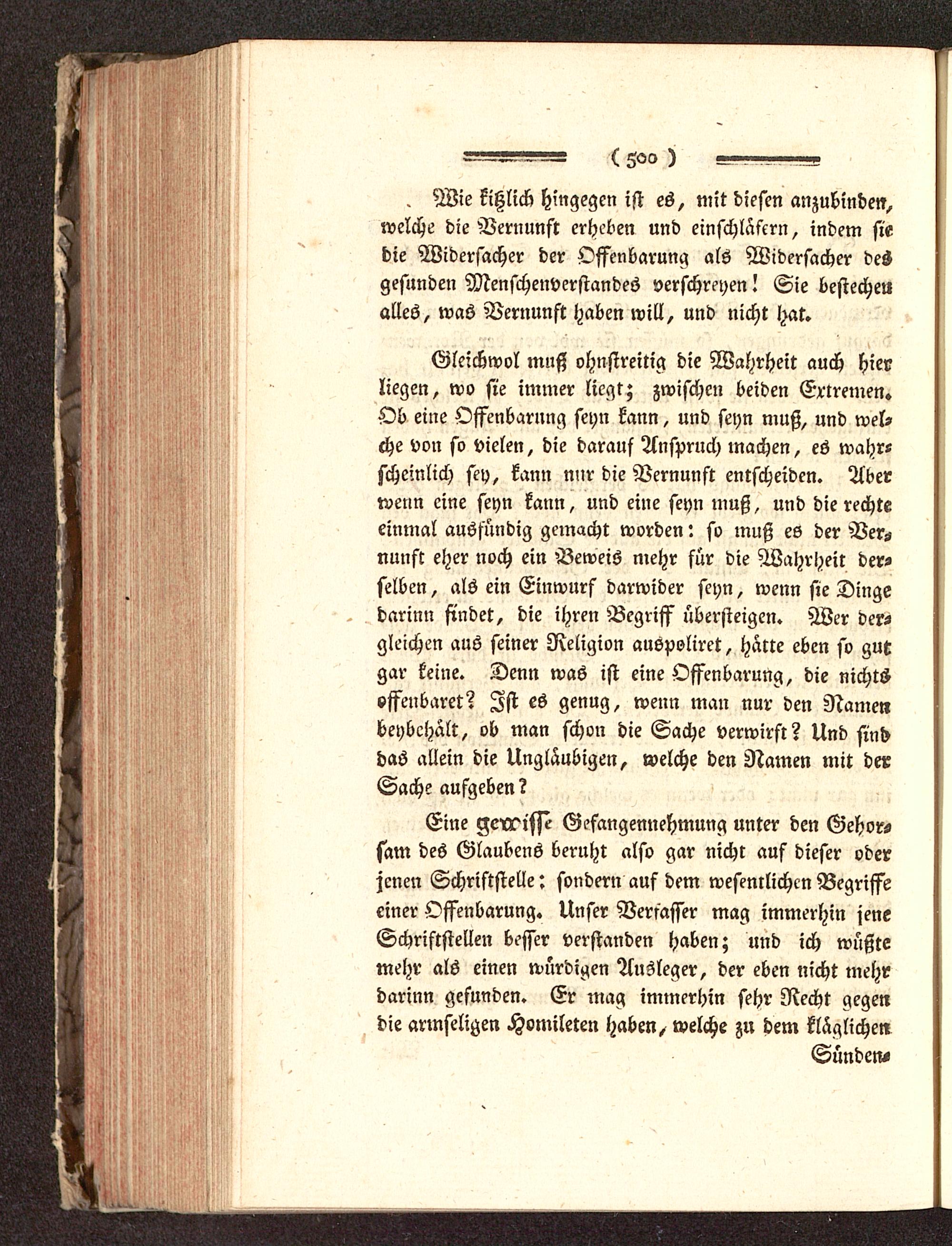Gleichwol muß ohnstreitig die Wahrheit auch hierliegen, wo sie immer liegt; zwischen beiden Extremen»Ob eine Offenbarung seyn kann, und seyn muß, und wel-che von so vielen, die darauf Anspruch machen, es wahr-scheinlich sey, kann nur die Vernunft entscheiden. Aberwenn eine seyn kann, und eine seyn muß, und die rechteeinmal ausfündig gemacht worden: so muß es der Ver-nunft eher noch ein Beweis mehr für die Wahrheit der-selben, als ein Einwurf darwider seyn, wenn sie Dingedarinn findet, die ihren Begriff übersteigen. Wer der-gleichen aus seiner Religion auspoliret, hatte eben so gutgar keine. Denn was ist eine Offenbarung, die nichtsoffenbaret? Ist es genug, wenn man nur den Name»beybchalt, ob man schon die Sache verwirft? Und sinddas allein die Ungläubigen, welche den Namen mit derSache aufgeben?