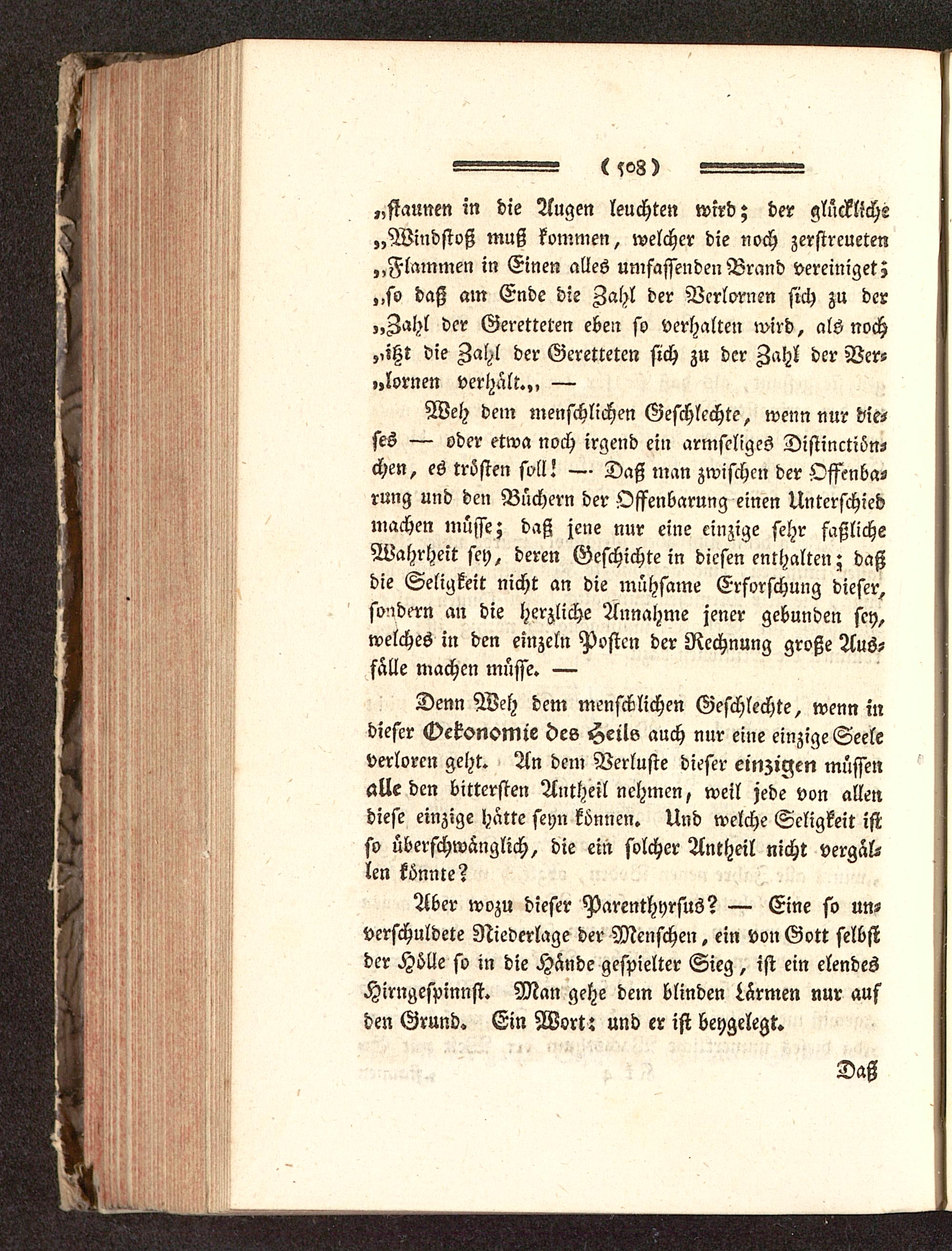 Denn Weh dem menschlichen Geschlechte, wenn indieser Octonomie des Heils auch nur eine einzige Seeleverloren geht. An dem Verluste dieser einzigen müssenalle den bittersten Antheil nehmen, weil jede von allendiese einzige hätte seyn können. Und welche Seligkeit istso überschwänglich, die ein solcher Antheil nicht vergäl-len könnte?