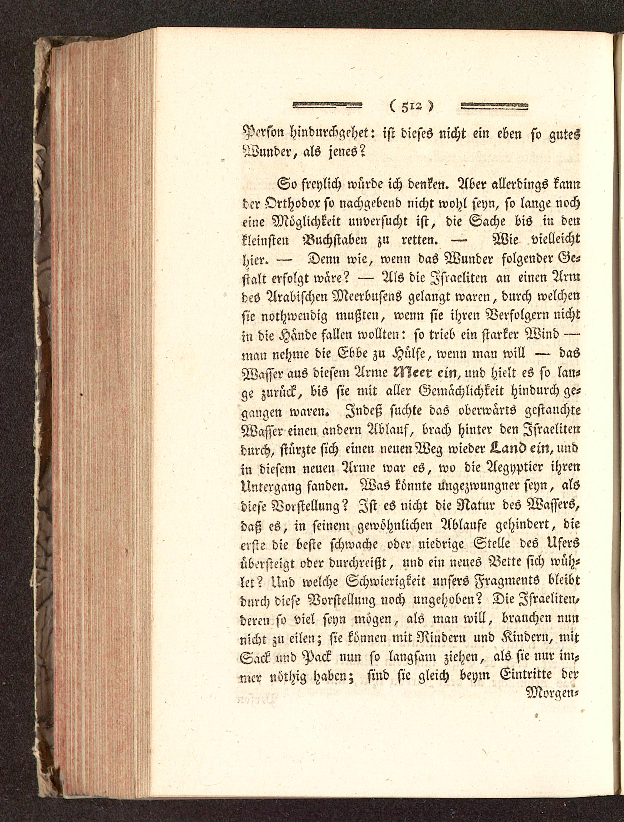 So freylich würde ich denken. Aber allerdings kannder Orthodox so nachgebend nicht wohl seyn, so lange nocheine Möglichkeit unversucht ist, die Sache bis in denkleinsten Buchstaben zu retten. — Wie vielleichthier. — Denn wie, wenn das Wunder folgender Ge-stalt erfolgt wäre? — Als die Israeliten an einen Armdes Arabischen Meerbusens gelangt waren, durch welchensie nothwendig mußten, wenn sie ihren Verfolgern nichtin die Hände fallen wollten: so trieb ein starker Wind —man nehme die Ebbe zu Hülfe, wenn man will — dasWasser aus diesem Arme Meer ein, und hielt es so lan-ge zurück, bis sie mit aller Gemächlichkeit hindurch ge-gangen waren. Indeß suchte das oberwarts gestauchteWasser einen andern Ablauf, brach hinter den Israelitendurch, stürzte sich einen neuen Weg wieder Tandem, undin diesem neuen Arme war es, wo die Aegypticr ihrenUntergang fanden. Was könnte ungezwungner seyn, alsdiese Vorstellung? Ist es nicht die Natur des Wassers,daß es, in seinem gewöhnlichen Ablaufe gehindert, dieerste die beste schwache oder niedrige Stelle des Ufersübersteigt oder durchreißt, und ein neues Vettc sich wüh-let ? Und welche Schwierigkeit unsers Fragments bleibtdurch diese Vorstellung noch ungehvben? Die Israeliten,deren so viel seyn mögen, als man will, brauchen nunnicht zu eilen; sie können mit Rindern und Kindern, mitSack und Pack nun so langsam ziehen, als sie nur im-mer nöthig haben; sind sie gleich beym Eintritte der