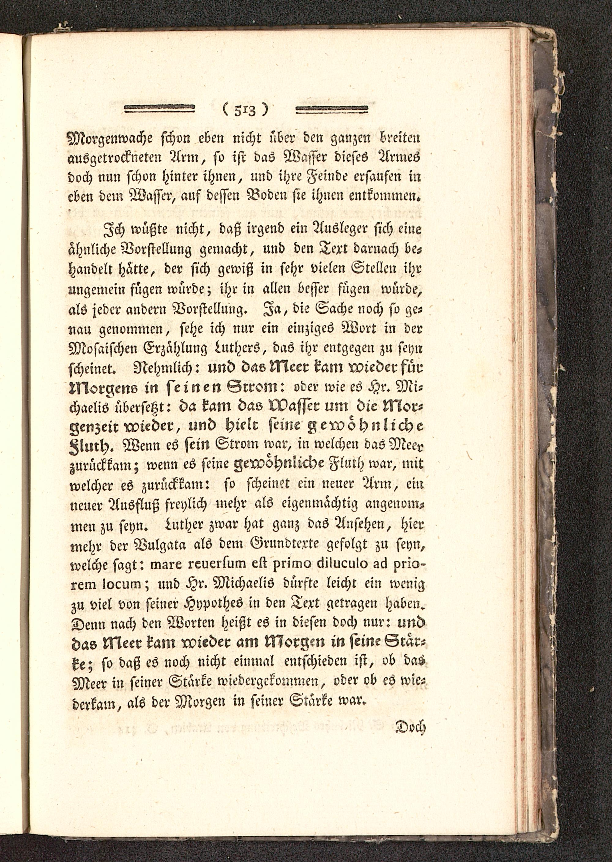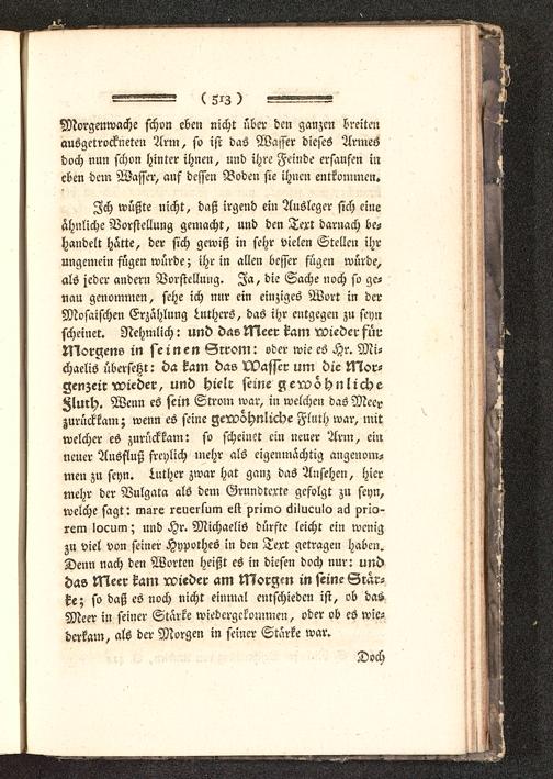 Ich wüßte nicht, daß irgend ein Ausleger sich eineähnliche Vorstellung gemacht, und den Text darnach be-handelt hatte, der sich gewiß in sehr vielen Stellen ihrungemein fügen würde; ihr in allen besser fügen würde,als jeder andern Vorstellung. Ja, die Sache noch so ge-nau genommen, sehe ich nur ein einziges Wort in derMofaischen Erzählung Luthers , das ihr entgegen zu seynscheinet. Nehmlich: und das Meer kam Mieder fürMorgens in seinen Strom: oder wie es Hr. Mi-chaelis übersetzt: da kam das Wasser um die Mor-genzeir wieder, und hielt seine gewöhnlicheFluch. Wenn es sein Strom war, in welchen das Meerzurückkam; wenn es seine gewöhnliche Fluth war, mitwelcher es zurückkam: so scheinet ein neuer Arm, einneuer Ausfluß freylich mehr als eigenmächtig angenom-men zu seyn. Luther zwar hat ganz das Ansehen, hiermehr der Vulgata als den, Grnndterte gefolgt zu seyn,welche sagt: mare reuerlum elt primo ctiluculo ücl prio-rem locum; und Hr. Michaelis dürste leicht ein wenigzu viel von seiner Hypothes in den Text getragen haben.Denn nach den Worten heißt es in diesen doch nur: unddas Meer kam wieder am Morgen in seine Stär-ke; so daß es noch nicht einmal entschieden ist, ob daSMeer in seiner Starke wiedergekommen, oder ob es wie-derkam, als der Morgen in seiner Starke war.