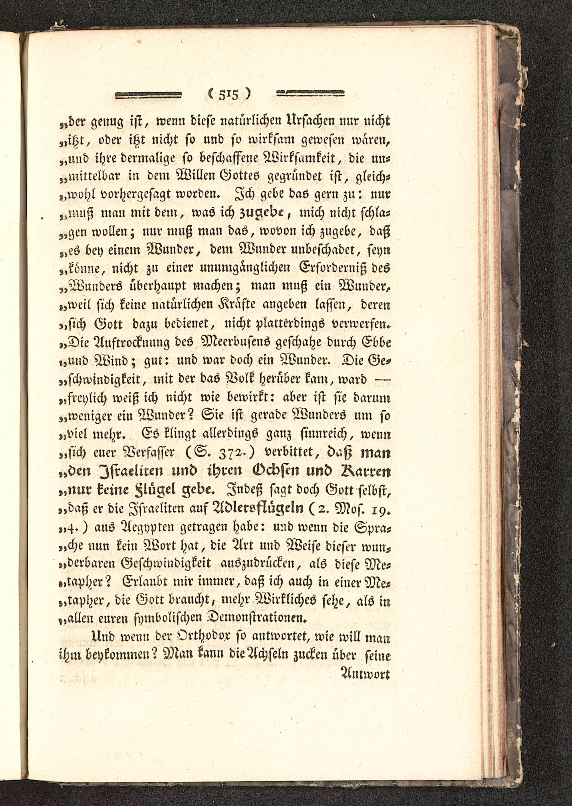 „den Iftaeliren und ihren Ocbsin und Darren„nur keine Flügel gebe. Indeß sagt doch Gott selbst,„daß er die Israeliten auf Adlersflügeln (2. Mos. 19.,.4.) aus Aegyptcn getragen habe: und wenn die Spra-„che nun kein Wort hat, die Art und Weise dieser wun-„derbaren Geschwindigkeit auszudrücken, als diese Me-„tapher? Erlaubt mir immer, daß ich auch in einer Mes„tapher, die Gott braucht, mehr Wirkliches sehe, als in„allen euren symbolischen Demonstrationen.