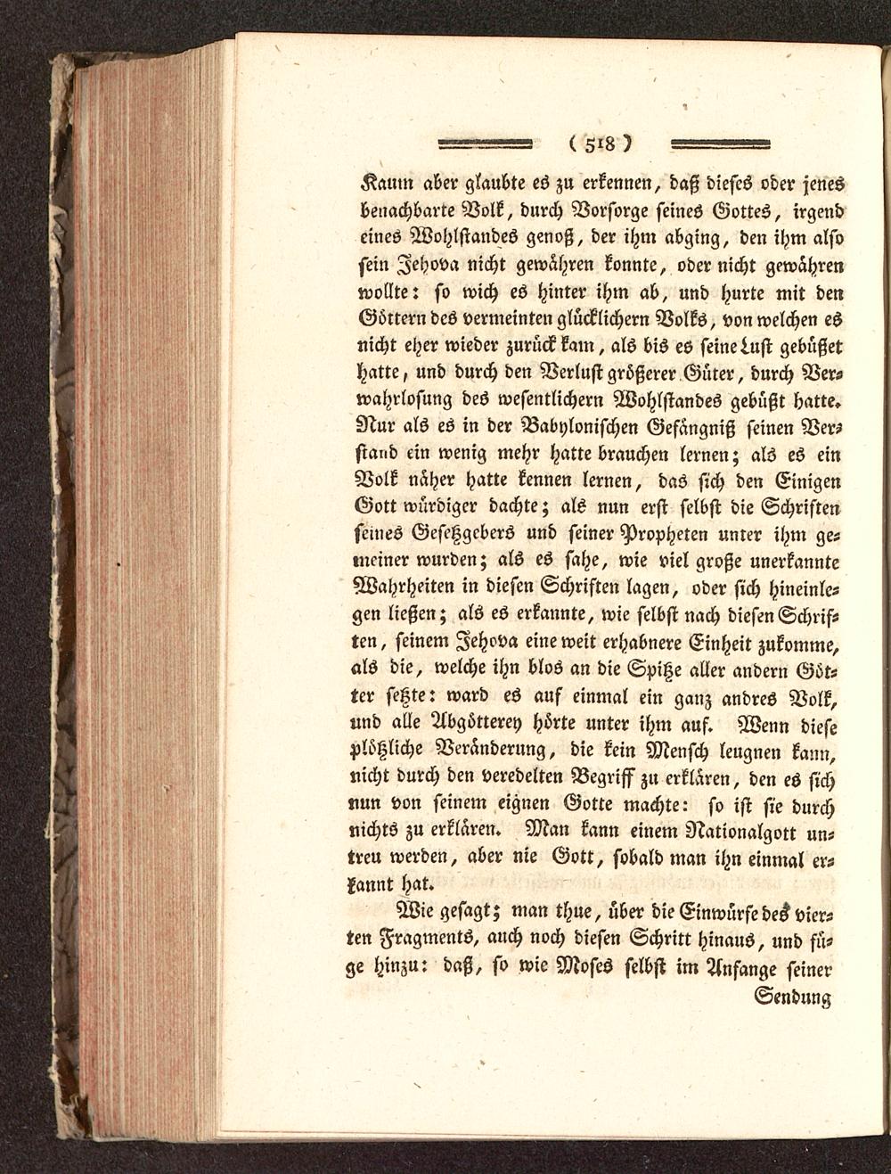 Kaum aber glaubte es zu erkennen, daß dieses oder jenesbenachbarte Volk, durch Vorsorge seines Gottes, irgendeines Wohlstandes genoß, der ihm abging, den ihm alsosein Zehova nicht gewähren konnte, oder nicht gewahrenwollte: so wich es hinter ihm ab, und hurte mit denGöttern des vermeinten glücklichern Volks, von welchen esnicht eher wieder zurückkam, als bis es seine inst gebüßethatte, und durch den Verlust größerer Güter, durch Ver-wahrlosung des wesentlichern Wohlstandes gebüßt hatte.Nur als es in der Babylonischen Gefängniß seinen Versstand ein wenig mehr hatte brauchen lernen; als es einVolk näher hatte kennen lernen, das sich den EinigenGott würdiger dachte; als nun erst selbst die Schriftenseines Gesetzgebers und seiner Propheten unrer ihm ge-meiner wurden; als es sahe, wie viel große unerkannteWahrheiten in diesen Schriften lagen, oder sich hineinle-gen ließen; als es erkannte, wie selbst nach diesen Schrif-ten, seinem Zehova eine weit erhabnere Einheit zukomme,als die, welche ihn blos an die Spitze aller andern Göt-ter setzte: ward es auf einmal ein ganz andres Volk,und alle Abgötterei) hörte unter ihm auf. Wenn dieseplötzliche Veränderung, die kein Mensch leugnen kann,nicht durch den veredelten Begriff zu erklären, den es sichmm von seinem eignen Gotte machte: so ist sie durchnichts zu erklaren. Man kann einem Nationalgott un-treu werden, aber nie Gott, sobald man ihn einmal er-kannt hat.