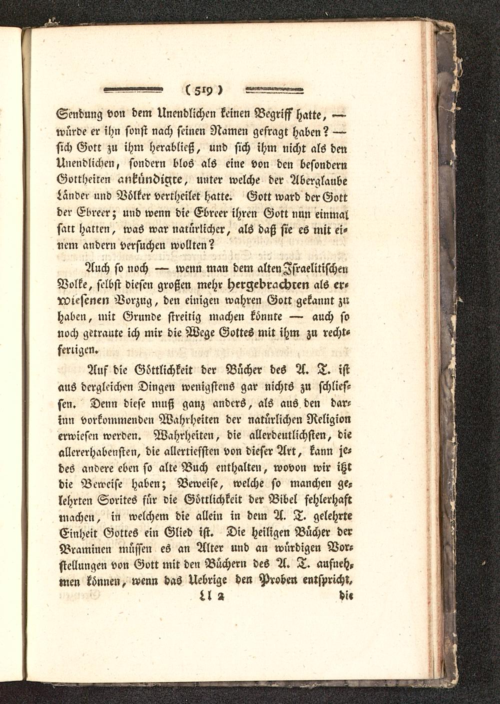 Auf die Göttlichkeit der Bücher des A. T. istaus dergleichen Dingen wenigstens gar nichts zu schlieftsen. Denn diese muß ganz anders, als aus den dar-um vorkommenden Wahrheiten der natürlichen Religionerwiesen werden. Wahrheiten, die allerdeutlichsten, dieallererhabensten, die allertiefsten von dieser Art, kann je-des andere eben so alte Buch enthalten, wovon wir ißtdie Beweise haben; Beweise, welche so manchen ge?lehrten Sorites für vie Göttlichkeit der Bibel fehlerhaftmachen, in welchem die allein in dem A. T- gelehrteEinheit Gottes ein Glied ist. Die heiligen Bücher derBrammen müssen es an Alter und an würdigen Vor?stellungen von Gott mit den Büchern des A. T. aufneh»wen können, wenn das Uebrige den Proben entspricht,