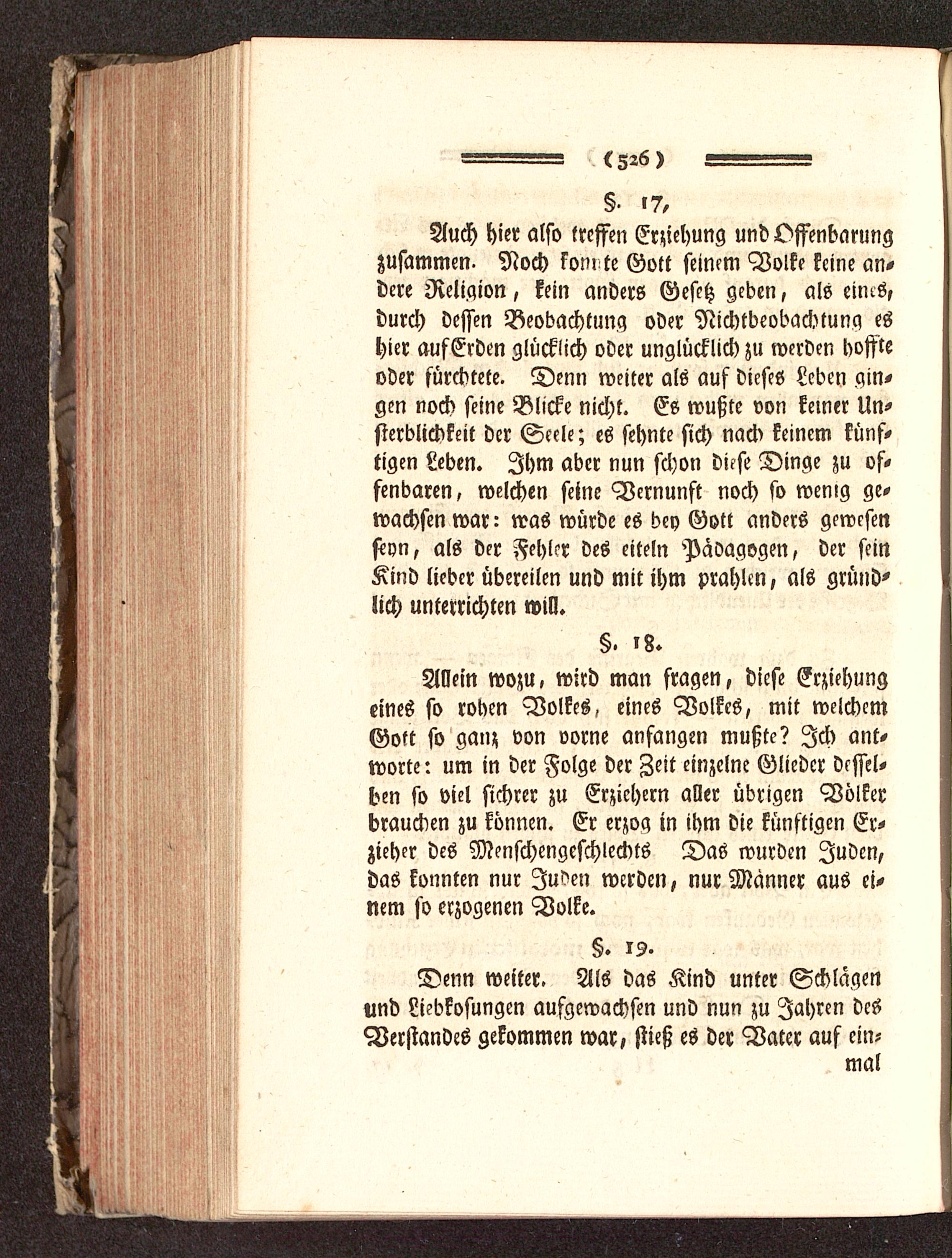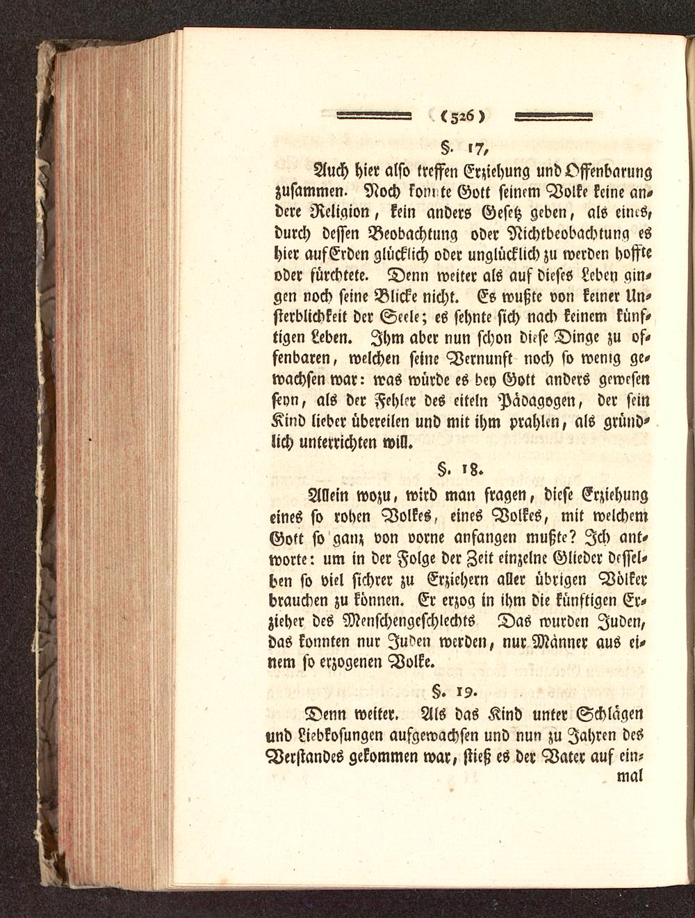 Auch hier also treffen Erziehung und Offenbarungzusammen. Noch konnte Gott seinem Volke keine an-dere Religion, kein anders Gesetz geben, als eims,durch dessen Beobachtung oder Nichtbeachtung eshier aufErden glücklich oder unglücklich zu werden boffteoder fürchtete. Denn weiter als auf dieses Leben gin-gen noch seine Blicke nicht. Es wußte von keiner Un-sterblichkeit der Seele; es sehnte sich nach keinem künf-tigen Leben. Ihm aber nun schon dich Dinge zu of-fenbaren, welchen seine Vernunft noch so wenig ge-wachsen war- was würde es bey Gott anders gewesenseyn, als der Fehler des eiteln Pädagogen, der seinKind lieber übereilen und mit ihm prahlen, als gründ-lich unterrichten will.
