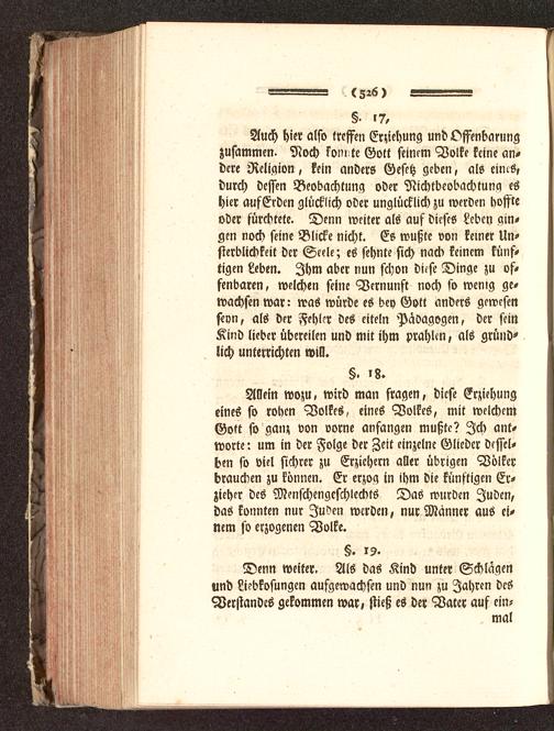 Allein wozu, wird man fragen, diese Erziehungeines so roben Volkes, eines Volkes, mit welchemGott so ganz von vorne anfangen mußte? Ich ant-worte: um in der Folge der Zeit einzelne Glieder dessel-ben so viel sichrer zu Erziehern aller übrigen Völkerbrauchen zu können. Er erzoq in ihm die künftigen Er-zieher des Menschengeschlechts Das wurden Juden,das konnten nur Juden werden, nur Männer aus ei-nem so erzogenen Volke.