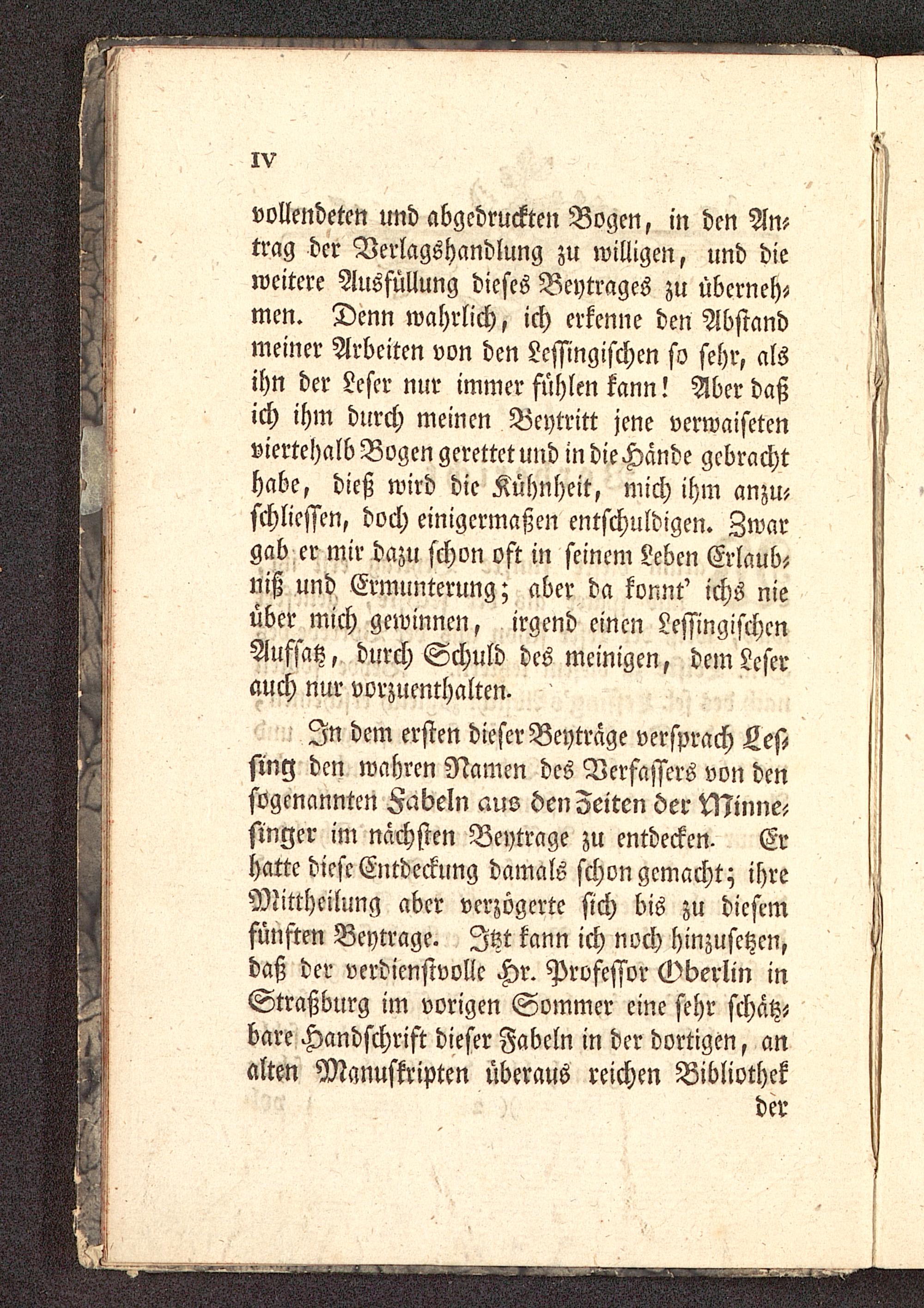 In dem ersten dieser Beytrage versprach Les-sing den wahren Namen des Verfassers von densogenannten Fabeln aus den Feiten der Minne-singer im nächsten Beytrage zu entdecken. Erhatte diese Entdeckung damals schöngemacht; ihreMittheilung aber verzögerte sich bis zu diesemfünften Beytrage. Jtzt kann ich noch hinzusetzen,daß der verdienstvolle Hr. Professor Gberlin inStraßburg im vorigen Sommer eine sehr schatz-bare Handschrift dieser Fabeln in der dortigen, analten Manuskripten überaus reichen Bibliothek