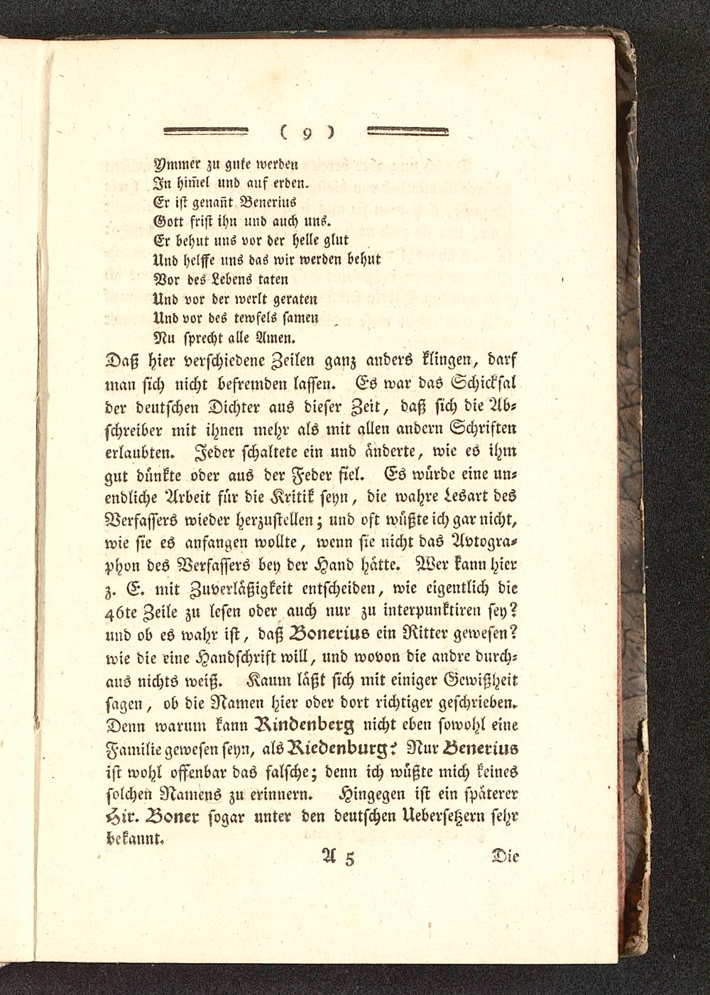 Nu sprecht alle Amen.Daß hier verschiedene Zeilen ganz anders klingen, darfman sich nicht befremden lassen. Es war das Schicksalder deutschen Dichter aus dieser Zeit, daß sich die Ab-schreiber mit ihnen mehr als mit allen andern Schriftenerlaubten. Zeder schaltete ein und änderte, wie es ihmgut dünkte oder aus der Feder siel. Es würde eine un-endliche Arbeit für die Kritik seyn, die wahre Lesart desVerfassers wieder herzustellen; und oft wüßte ich gar nicht,wie sie es anfangen wollte, wenn sie nicht das Avtogra-phvn des Verfassers bey der Hand hatte. Wer kann hierz. E. mit Zuverlaßigkeit entscheiden, wie eigentlich die46te Zeile zu lesen oder auch nur zu interpunktiren sey?und ob es wahr ist, daß Vonerius ein Ritter gewesen?wie die eine Handschrift will, und wovon die andre durch-aus nichts weiß. Kaum laßt sich mit einiger Gewißheitsagen, ob die Namen hier oder dort richtiger geschrieben.Denn warum kann Rindenberg nicht eben sowohl eineFamilie gewesen seyn, als Riedenburg ? NurLeneriusist wohl offenbar das falsche; denn ich wüßte mich keinessolchen Namens zu erinnern. Hingegen ist ein spaterer«Str. Boner sogar unter den deutschen Uebersetzern sehrbekannt.