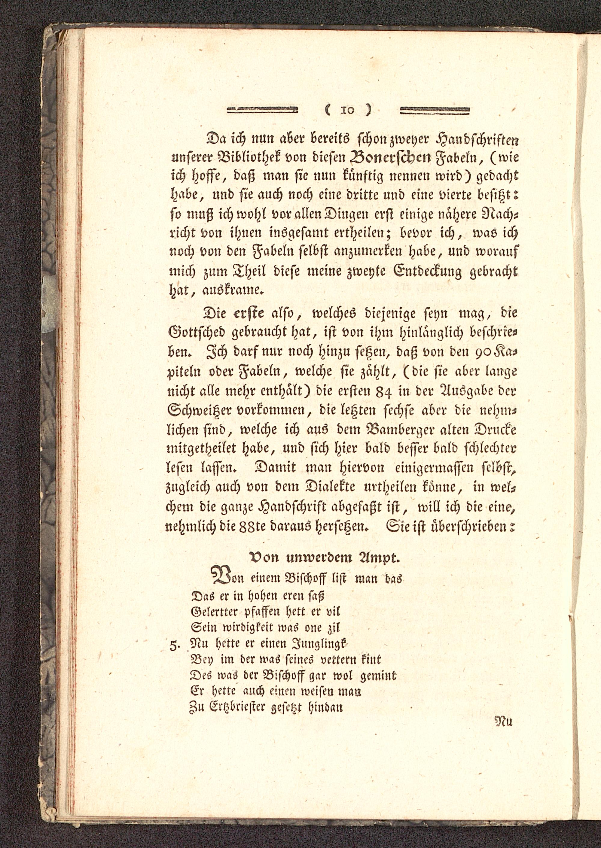 Die erste also, welches diejenige seyn mag, dieGottsched gebrauchthat, ist von ihm hinlänglich beschrie-ben. Ich darf nur noch hinzu setzen, daß von den 90 Ka-piteln oder Fabeln, welche sie zählt, (die sie aber langenicht alle mehr enthalt) die ersten 84 in der Ausgabe derSchweitzer vorkommen, die letzten scchse aber die nehm-lichen sind, welche ich aus dem Bamberger alten Druckemitgetheilet habe, uud sich hier bald besser bald schlechterlesen lassen. Damit man hiervon einigermassen selbst.Zugleich auch von dem Dialekte urtheilen könne, in wel-chem die ganze Handschrift abgefaßt ist, will ich die eine,nehmlich die 88te daraus hersetzen. Sie ist überschrieben;