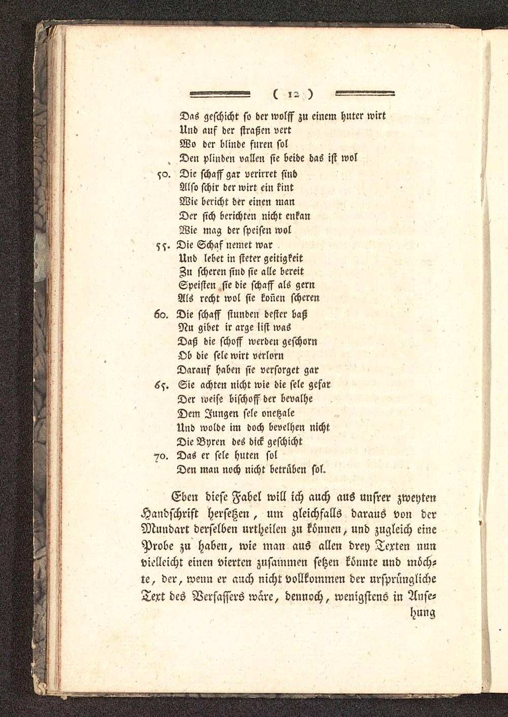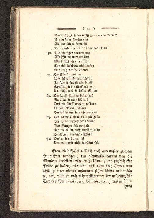Eben diese Fabel will ich auch aus unsrer zweytenHandschrift hersetzen, um gleichfalls daraus von derMundart derselben urtheilen zu können, und zugleich eineProbe zu haben, wie man aus allen drey Texten nunvielleicht einen vierten zusammen setzen könnte und möch-te, der, wenn er auch nicht vollkommen der ursprünglicheText des Verfassers wäre, dennoch, wenigstens in Anse-hung