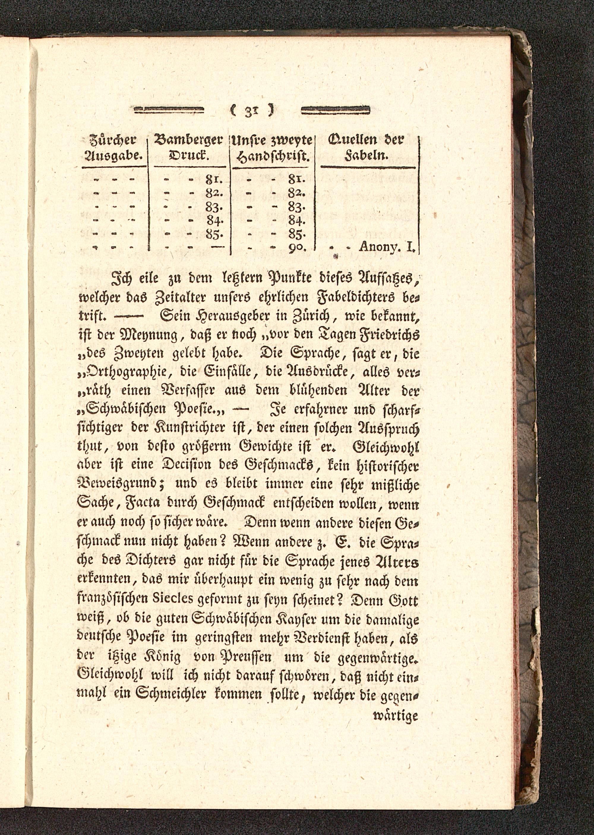 Ich eile zu dem letztern Punkte dieses Aufsatzes,welcher das Zeitalter unsers ehrlichen Fabeldichters be-trist. - Sein Herausgeber in Zürich , wie bekannt,