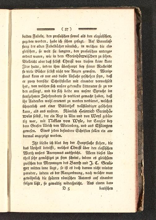beiden Fabeln, den prosaischen sowol als den elegieischen,gegeben worden, habe ich schon gesagt. Auf Veranlas-sung der alten Fabelbücher nämlich, in welchen die elesgicischen, so weit sie langten, den prosaischen unterge-ordnet waren, wie in dem Gremhörveischest zu sehen.Vielleicht aber daß selbst Christ von diesem keine klareIdee hatte, indem ihm überhaupt bey seiner Nachricbtso viele Bücher selbst nicht vor Augen gewesen. Wenig-stens kann es nur auS dieser Ursache geschehen seyn, daßer zwey deutsche Schriftsteller mit einander verwechselthat, von welchen sich unsere gedruckte Litteratur so zu re-den anfangt, und die sich beide um unsere Sprache imfünfzehnten Jahrhunderte so verdient gemacht haben, daßihr Andenken wohl erneuert zu werden verdienet, welchesschwerlich aus einer Bibliothek vollständiger geschehenkann, als aus unserer. Nämlich Heinrich Srcinho-N>eln selbst, der ein Arzt in Ulm und von N?e>ol gebür-tig war, mit Niklas von VV'sle, der Canzler beydem Grafen Ulrich von Wirtenberg, und aus Eßlingen gewesen. Eines jeden besondere Schriften sollen ein an-dermal angezeigt werden.