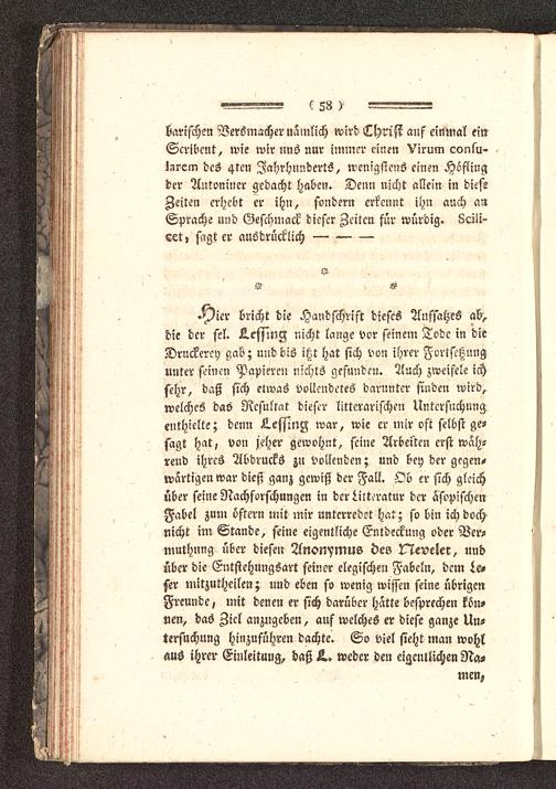 Hier bricht die Handschrift dieses Aufsatzes ab,die der ftl. L.essmZ nicht lange vor seinem Tode in dieDruckerey gab; und bis itzt hat sich von ihrer Fortsetzungunter seinen Papieren nichts gefunden. Auch zweifele ichsehr, daß sich etwas vollendetes darunter finden wird,welches das Resultat dieser litterarischen Untersuchungenthielte; denn L.esjmg war, wie er mir oft selbst ge-sagt hat, von jeher gewohnt, seine Arbeiten erst wah-rend ihres Abdrucks zu vollenden; und bey der gegen-wärtigen war dieß ganz gewiß der Fall. Ob cr sich gleichüber seine Nachforschungen in der Litteratur der äsopischenFabel zum östern mit mir unterredet hat; so bin ich dochnicht im Stande, feine eigentliche Entdeckung oder Ver-muthung über diesen Anonymus des Nevcier, undüber die Sutstehungsart seiner elegischen Fabeln, dem Le-ser mitzutheilen; und eben so wenig wissen seine übrigenFreunde, mit denen er sich darüber hatte besprechen kön-nen, das Ziel anzugeben, auf welches er diefe ganze Un-tersuchung hinzuführen dachte. So viel sieht man wohlaus ihrer Einleitung, daß L.» weder den eigentlichen Na-,