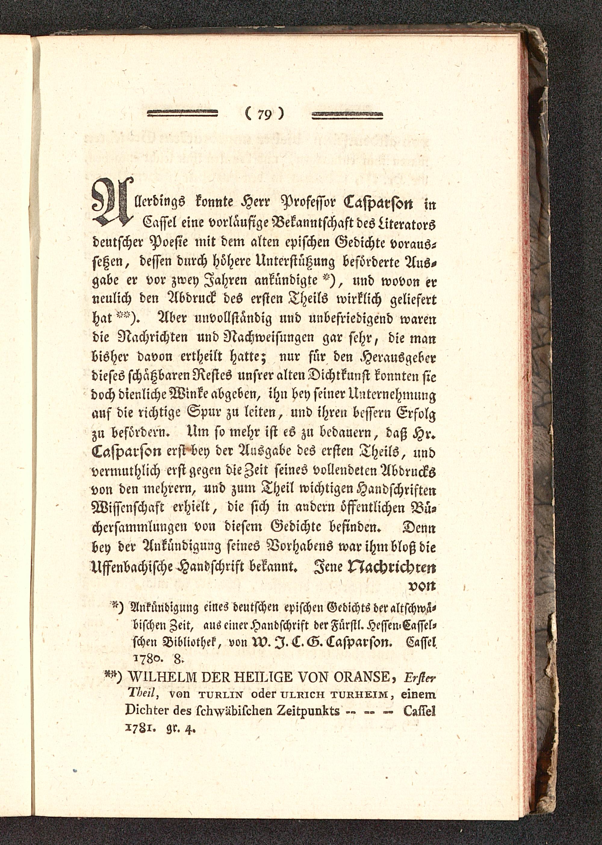 llcrdings konnte Herr Professor Cajparsott inCassel eine vorläufige Bekanntschaft des Literatorsdeutscher Poesie mit dem alten epischen Gedichte voraus-setzen, dessen durch höhere Unterstützung beförderte Aus-gabe er vor zwey Jahren ankündigte ^), und wovon erneulich den Abdruck des ersten Theils wirklich gelieferthat^'). Aber unvollständig und unbefriedigend warendie Nachrichten und Nachweisungen gar sehr, die manbisher davon ertheilt hatte; nur für den Herausgeberdieses schatzbaren Restes unsrer alten Dichtkunst konnten siedoch dienliche Winke abgeben, ihn bey seiner Unternehmungauf die richtige Spur zu leiten, und ihren bessern Erfolgzu befördern. Um fo mehr ist es zu bedauern, daß Hr.Cajparson erst-bey der Ausgabe des ersten Theils, undvermuthlich erst gegen die Zeit seines vollendeten Abdrucksvon den mehrern, und zum Theil wichtigen HandschriftenWissenschaft erhielt, die sich in andern öffentlichen Bü-chersammlungcn von diesem Gedichte befinden. Dennbey der Ankündigung seines Vorhabens war ihm bloß dieUffenbachische Handschrift bekannt. Jene Nachrichten
